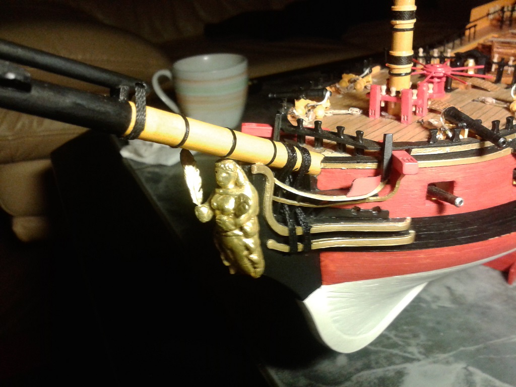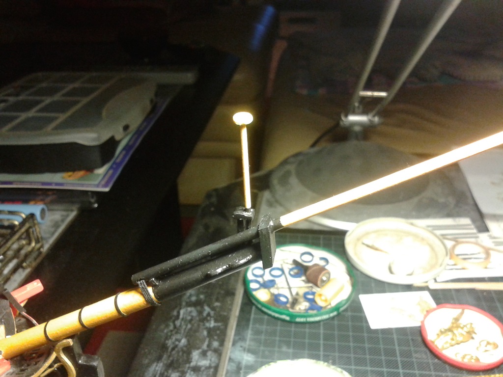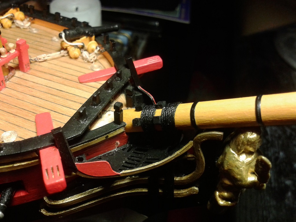 Prace przy olinowaniu bukszprytu - watersztagi i wanty. Wanty mocowane są do burt za pomocą haków. Zastosowałem serca do łączenia want i watersztagów z bukszprytem