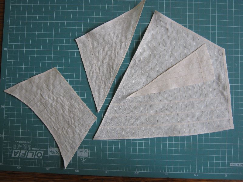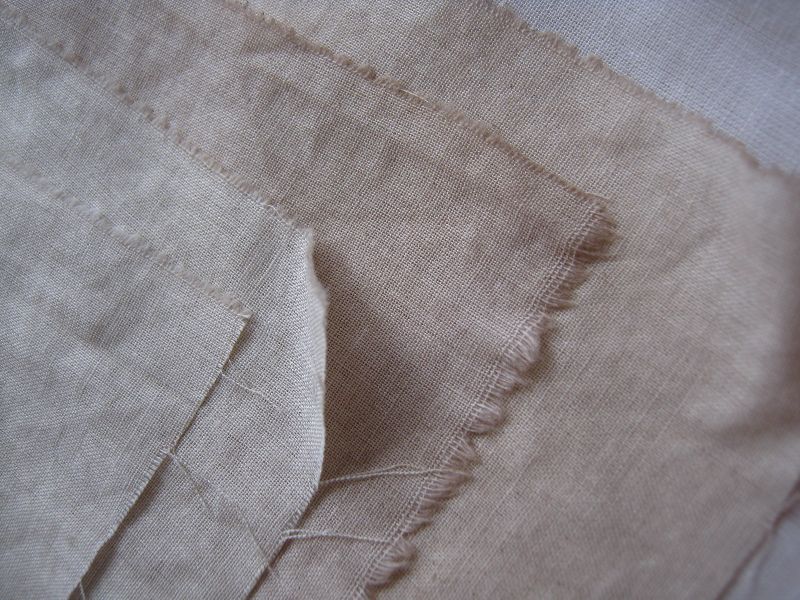 Batyst podzieliłem na mniejsze "szmatki" zależne od kształtów żagli z dosyć wielkim naddatkiem (bałem się, że przy wrzuceniu do wywaru z herbaty całego batystu niepociętego, ten się pobarwi niejednolicie, wolałem nie ryzykować więc lepsze były mniejsze kawałki aby mieściły się w garnku bez większego zaginania). Przed tym wszystkim wyciąłem jeszcze kilka mniejszych "szmatek", które posłużyły mi dalej jako próbki.