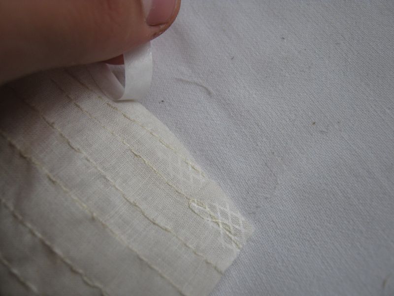 Do przyklejania naddatków na drugą stronę żagla, refbant i lików użyłem takiej taśmy krawieckiej do podklejania mankietów (nie wiem jak to się nazywa, dostałem od mamy). Taśma ta posiada klej, który topi się pod wpływem ciepła, jest prawie niewidoczny, dlatego specjalnie do zdjęcia przechyliłem pod światło ten żagielek aby było widać klej.
