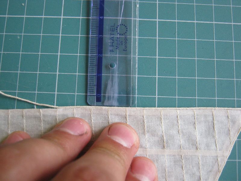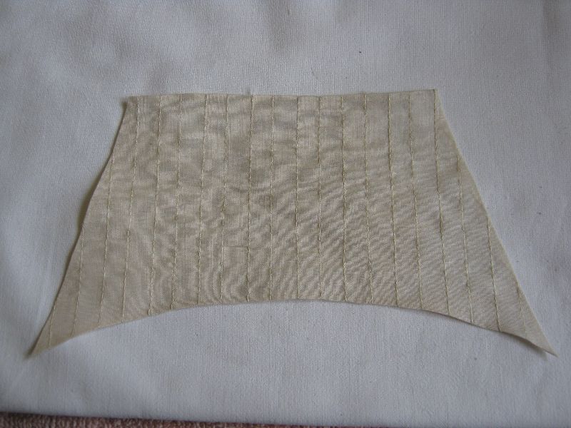 Na wykrochmalonych szmatkach odrysowałem z brystolowych szablonów żagle i później bryty z wycinanki (batyst jest cieniutki i prześwitujący). Zwrócić należy także uwagę na to aby splot materiału szedł po długości żagla a nie krzywo na skos. Na zdjęciu jest akurat cała szmatka, nie pocięta na mniejsze kawałki (to zdjęcia z robienia tych pierwszych żagli). Właśnie tam też zrobiłem błąd bo najpierw odrysowałem żagle, później barwiłem i przy prasowaniu okazało się że większość z nich się "odkształciła" (batyst jest cieniutki i elastyczny)