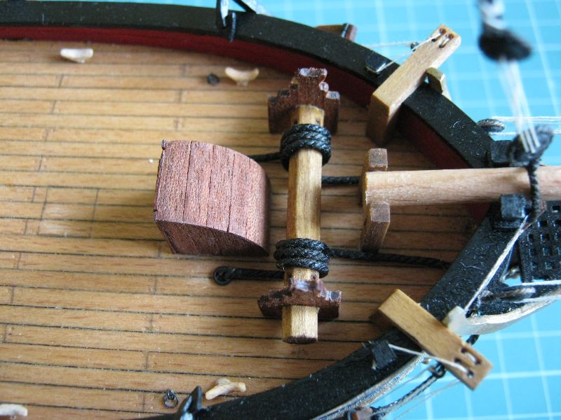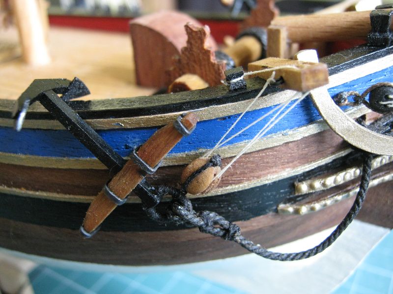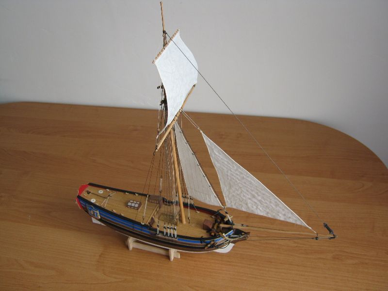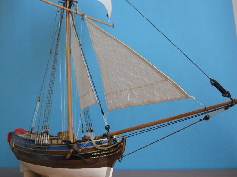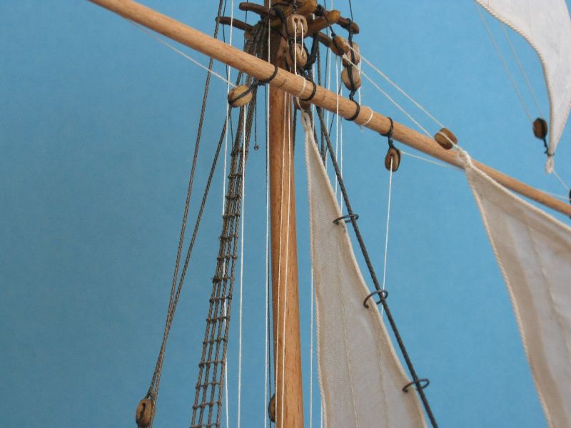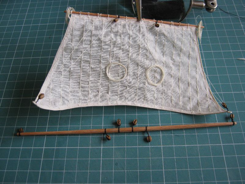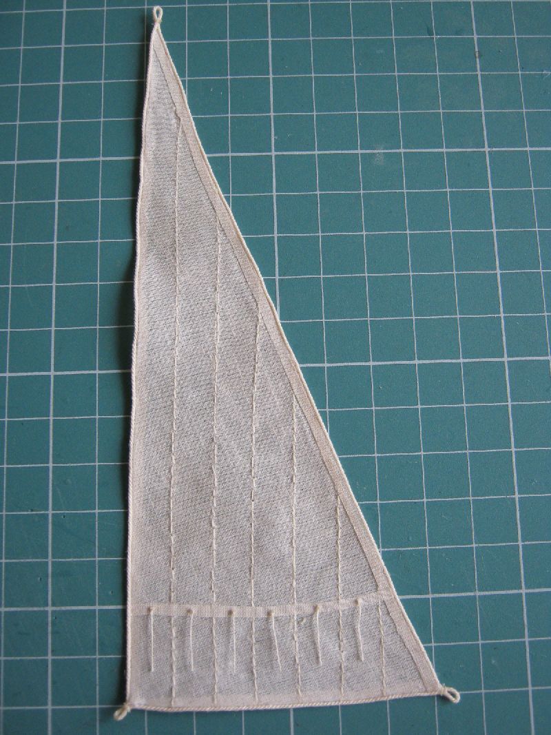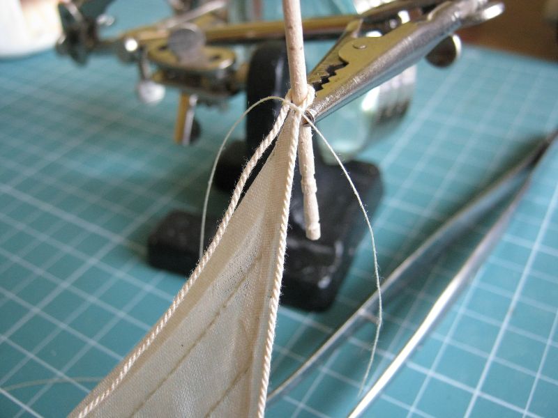 Osobiście żagielki mi się podobają. Pierwotnie liklina i liki miały być obszywane nitką ale po konsultacjach z bardziej doświadczonymi modelarzami doszliśmy do wniosku, że skala jest za mała. Reflinki na jednym na razie żagielku są doklejane na Patexxie (węzełek moczony w kleju i przyklejany), jakoś nie szło mi wiązanie węzełków z dwóch stron.