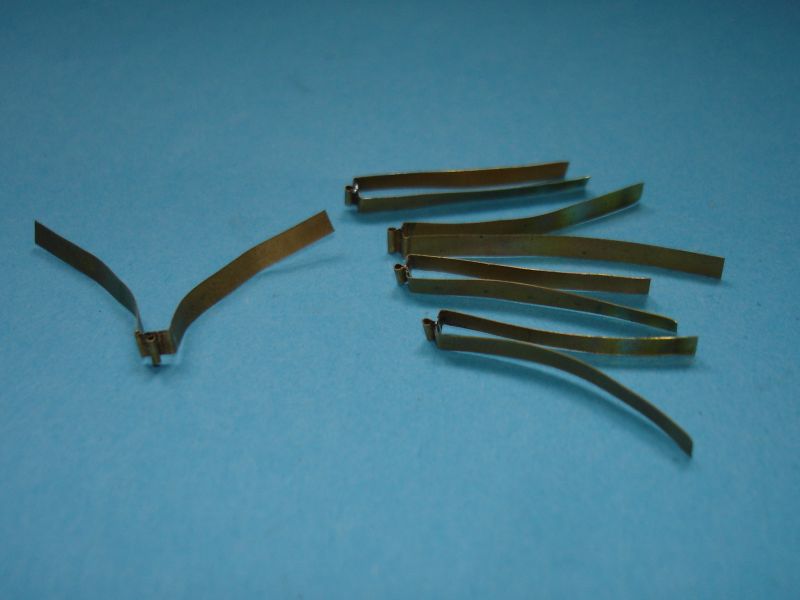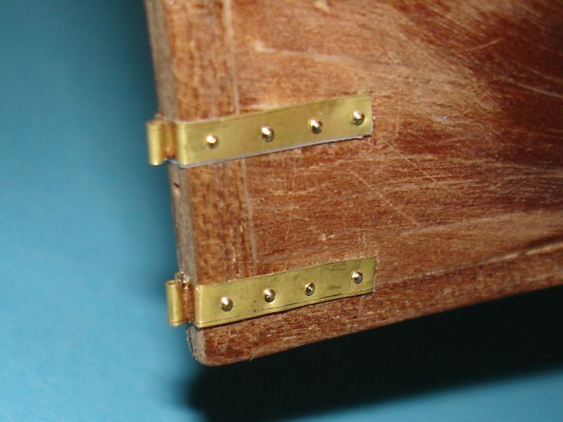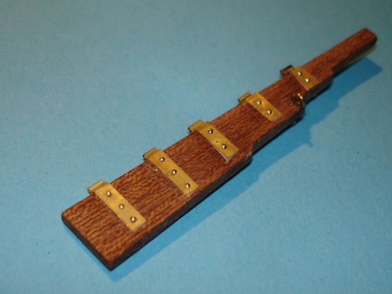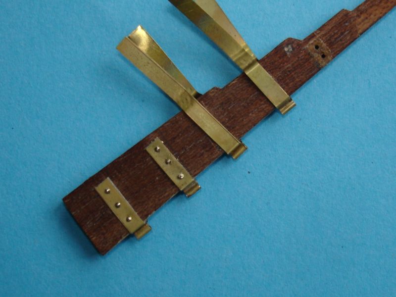 Męczarni w stoczni remontowej ciąg dalszy. Jak już wspomniałem w poprzednim poście, zabrałem się do poprawienia steru, a ściślej mówiąc do zmiany okuć. Z blachy mosiężnej 0,3 mm wyciąłem paski i uformowałem z nich tuleje zawiasów. Blaszka jest na pewno za cienka :? . Powinna mieć gr. 0,5 mm, ale nie mam innej. Następnie, posiłkując się taśmą "dwustronną", zawiasy przykleiłem do steru. Otworki wywierciłem wiertłem 0,5 mm. W otwory wcisnąłem gwoździe mosiężne o średnicy 0,5 mm i o średnicy łba 0,8 mm. Musiałem je deczko skrócić, gdyż ster ma grubość 2,8 mm, a gwoździe są długie na 3 mm.