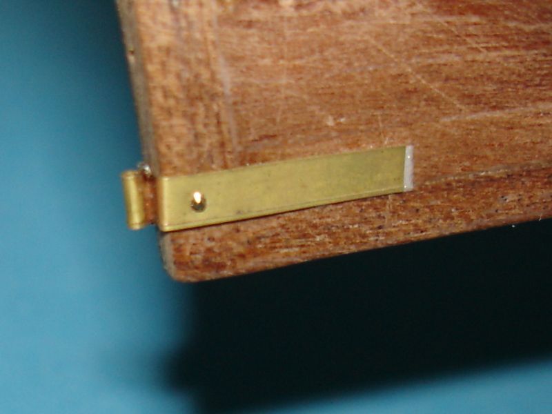 Podobnie zrobiłem z zawiasami na stewie. Rysy, które widać na zdjęciu, nie są rysami na drewnie :( . Kadłub już przedtem pokryłem 1 warstwą lakieru i są to ryski lakieru. Przy następnej warstwie lakieru na pewno znikną. Kurcze, kłopoty ze wzrokiem zaczynają dawać znać o sobie. Muszę sprawić sobie jakieś modelarskie szkiełka. Może koledzy mi poradzą, gdzie je nabyć?
