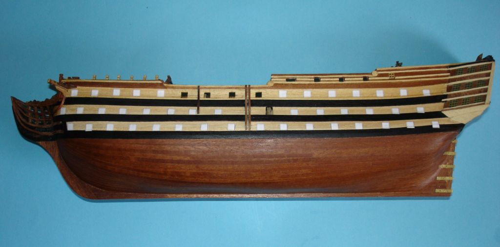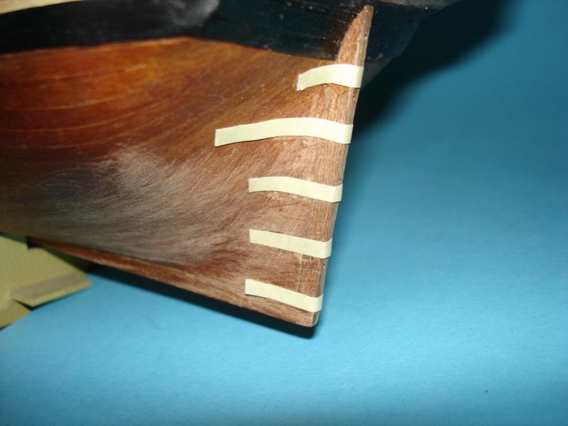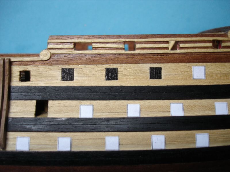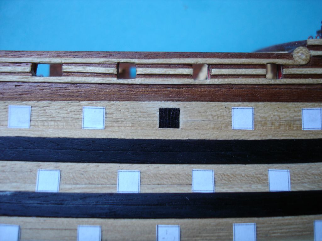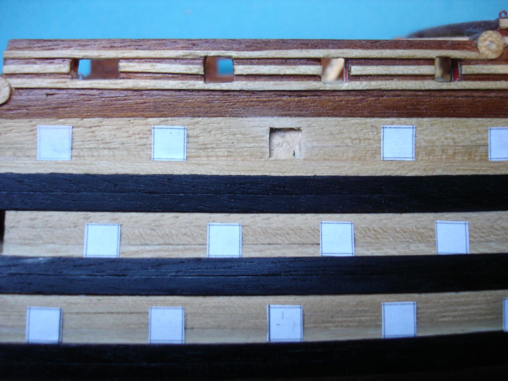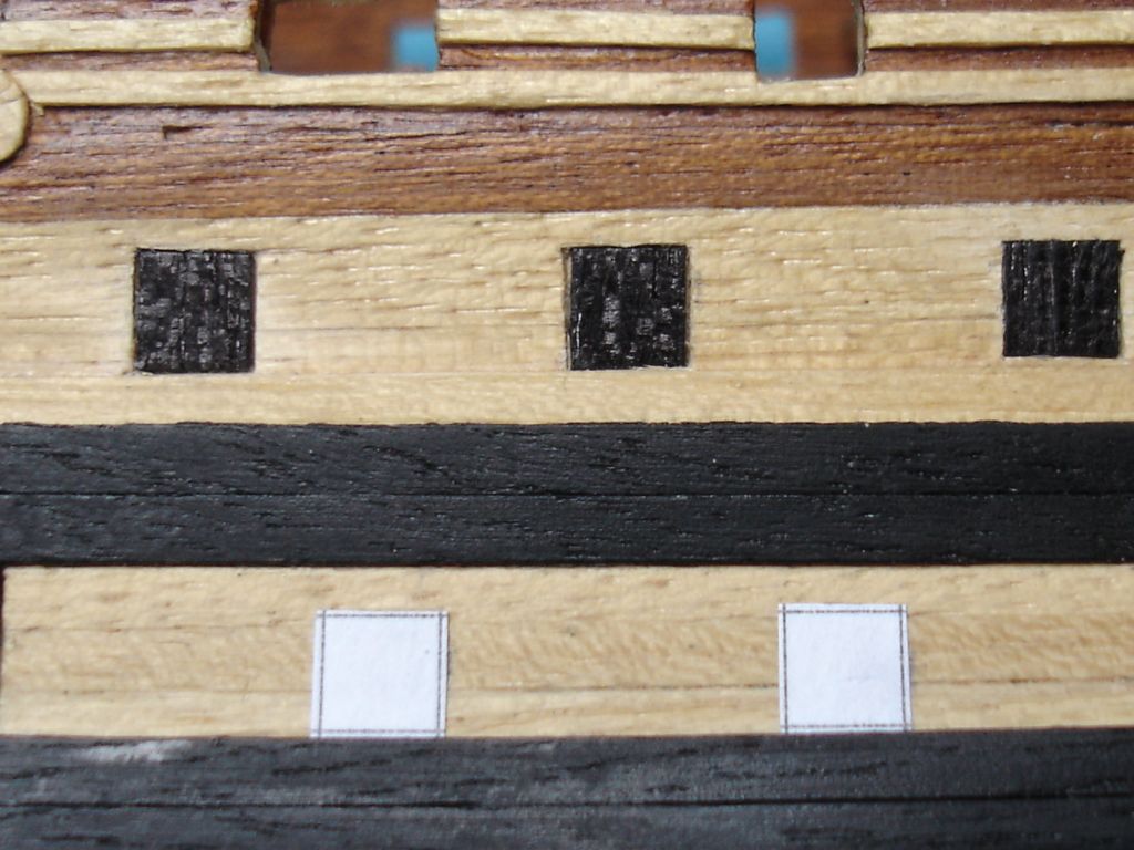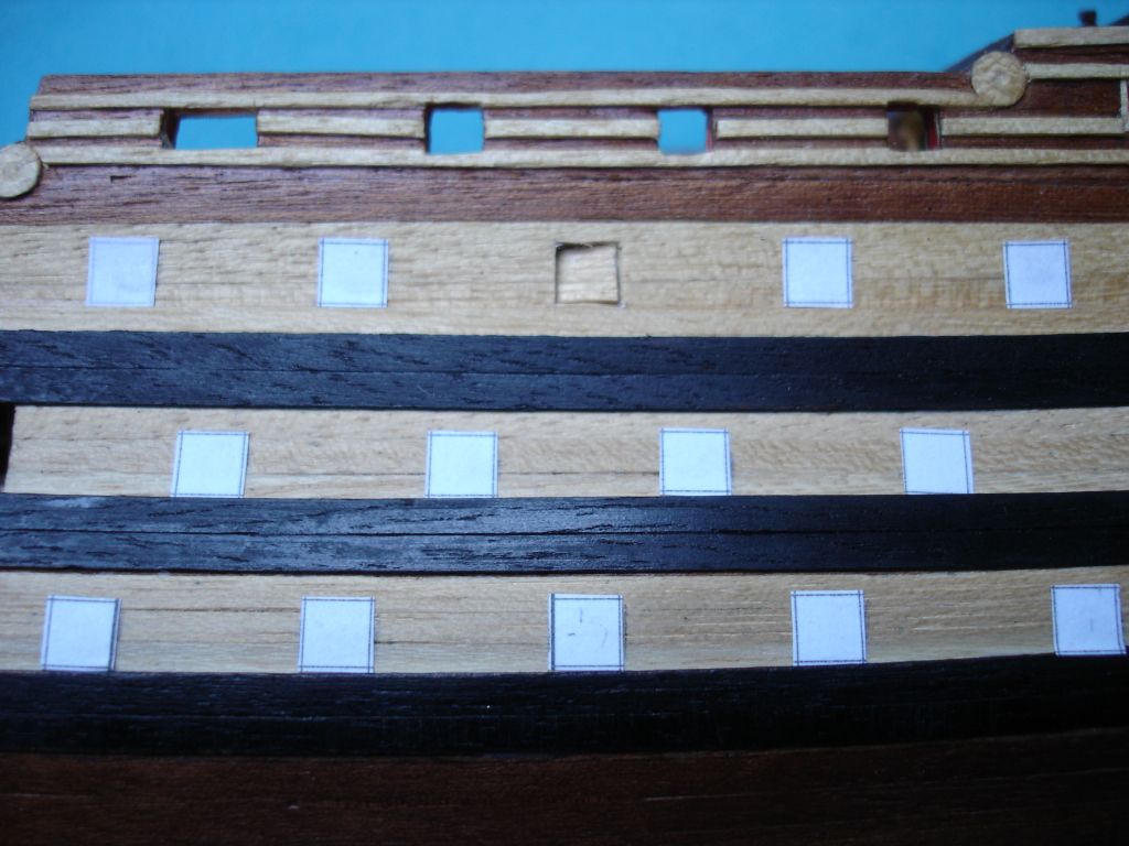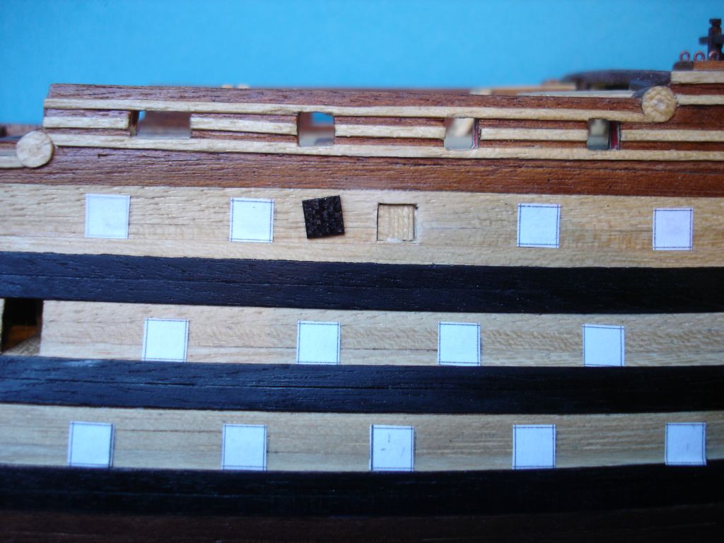Witam ponownie. Ostatnio udało mi się wykonać furty działowe. Po wycięciu szablonów z kartki papieru w kratkę, żeby sobie ułatwić wycinanie otworów, przykleiłem je do burt. Z pasków forniru (lime strips), po uprzednim zabarwieniu czarnym markerem, wyciąłem furty o wymiarach 5X5 mm i wkleiłem w wycięte otwory. Bardzo to żmudna praca. Nabawiłem się odcisku na kciuku.
