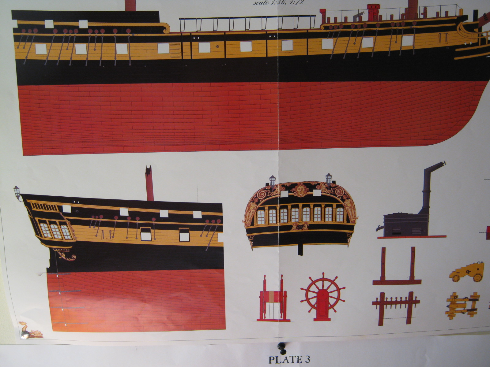 Wybrałem tą drugą opcję, chociaż w pierwszej widać więcej "żywego" drewna i troszkę szkoda je zamalować ale druga wersja po prostu mi się bardziej podoba. Poza tym dochodzi wyzwanie miedziowania. I tutaj od razu widzę problem. Na planach blachy pokazane są tak, że dolne blachy mają przykrywać górne czyli, że miedziowanie należy zacząć od linii wodnej do stępki.