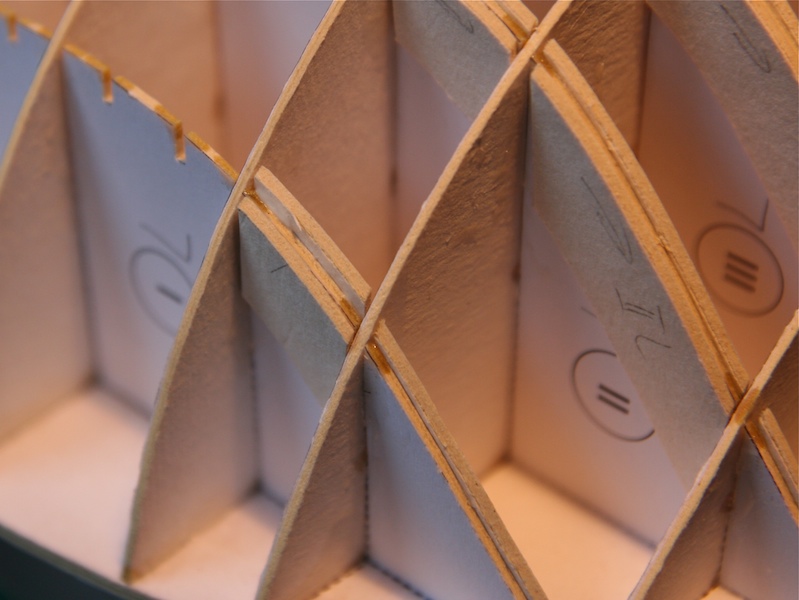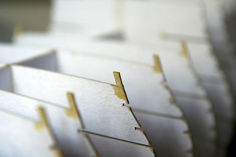 Elementy szkieletu, zgodnie z projektem, zostały naklejone na tekturę grubości 1 mm. Wystające elementy wręg oraz końcówki szczelin, w które wsuwane są wręgi i podłużnice zostały przed sklejeniem w całość zalane cyjanoakrylem. Zalecam wykonanie tego zabiegu zwłaszcza w odniesieniu do wystających na wręgach wąsów, na których będą opierały się nadburcia. Jeśli się tego nie zrobi, to późniejsze manewrowanie kadłubem powoduje, że bardzo łatwo jest je pozaginać. A tak mamy święty spokój. Jeśli chodzi o zalewanie szczelin unika się w ten sposób rozwarstwiania tektury przy łączeniu elementów szkieletu.