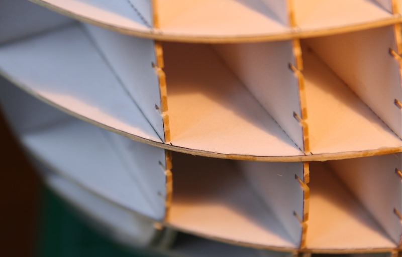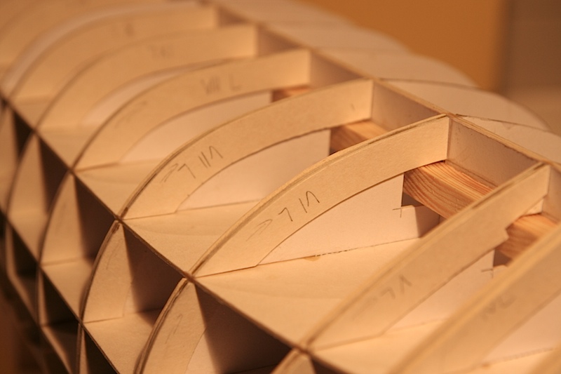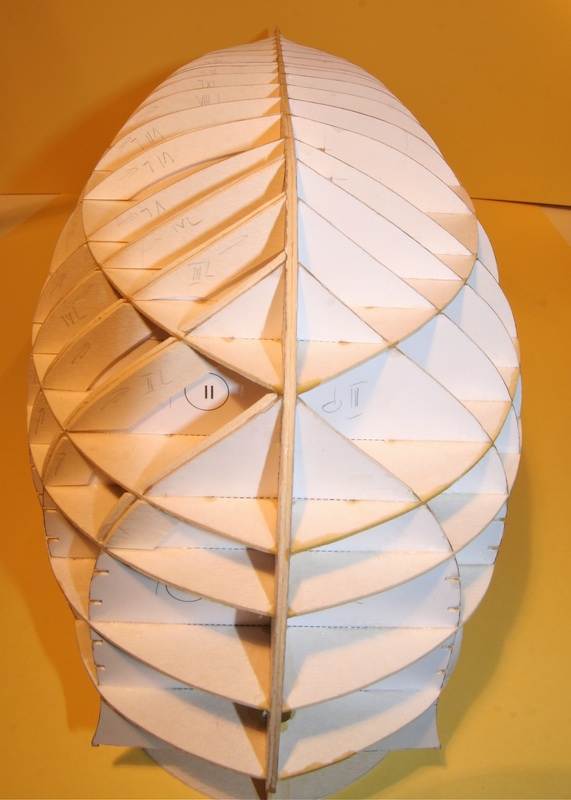 Każda wręga została pogrubiona poprzez naklejenie dodatkowych pasków wręgi o gr. 1mm i szerokości ok. 1 cm tak, aby do linii wodnej uzyskać wręgę o grubości 3 mm. W ten sposób zwiększyłem powierzchnię, na której będą przyklejane elementy poszycia dna. Przyklejenie ich na wrędze o grubości 1 mm jest wprawdzie możliwe, ale to bardzo kruche mocowanie. Można to oczywiście zrobić także w ten sposób, że na wręgi przyklejamy dodatkowe paski papieru i do nich przymocowujemy oklejki kadłuba. Wybór metody należy pozostawić każdemu sklejaczowi, moja wcale nie musi być idealna i to jaka będzie, tak naprawdę okaże się w praniu.