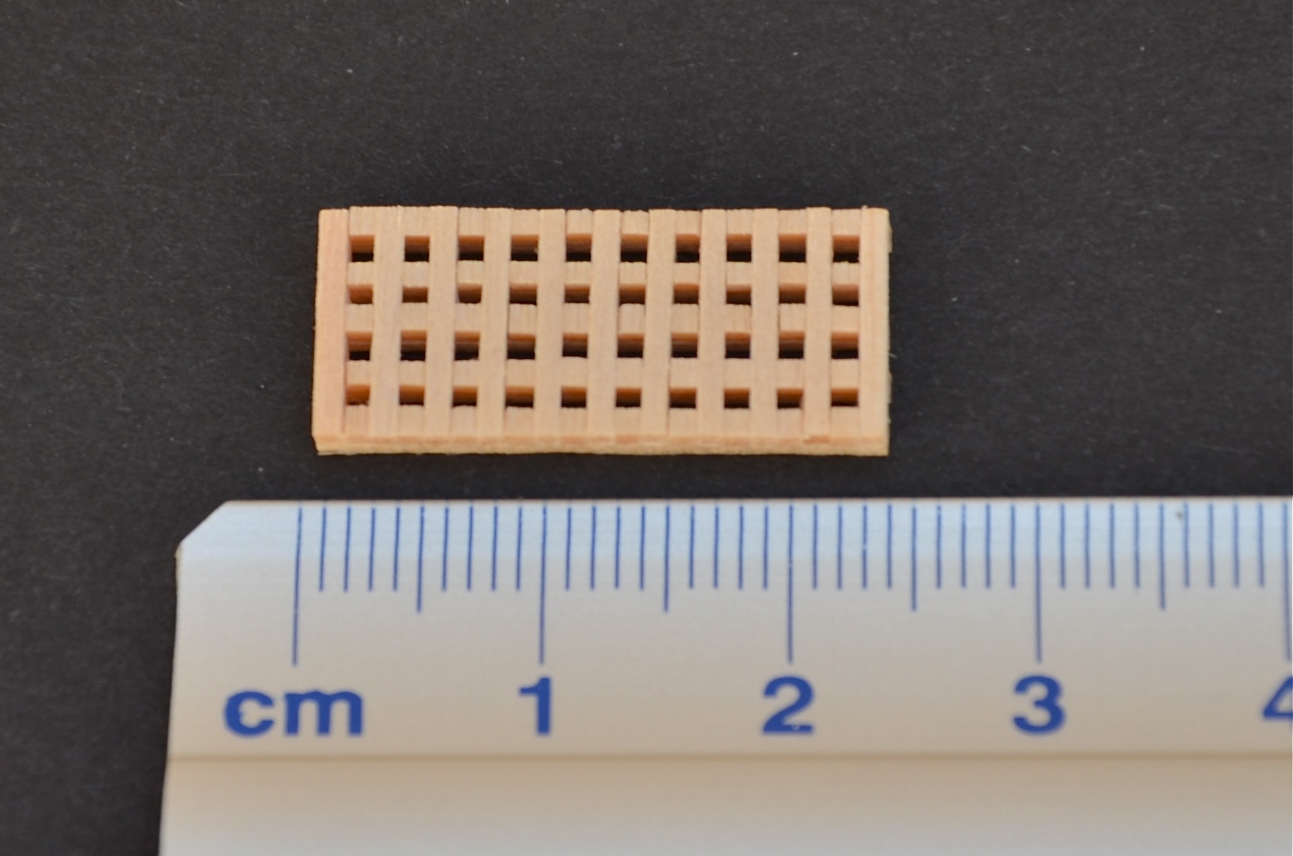 Po kilku nieudanych próbach zrobiłem swój pierwszy greting, wg metody opisanej tutaj http://www.koga.net.pl/forum/viewtopic.php?f=10&t=45378. Początkowo próbowałem wykonywać go z forniru brzozowego. Sklejałem ze sobą dwie warstwy forniru tak, aby uzyskać arkusz o grubości 1 mm. Tak gruby fornir brzozowy trudno było jednak ciąć żyletką - cięcie było albo krzywe, albo odłupywały się ząbki. Efekt widać na pierwszy zdjęciu. Ostatecznie greting wykonałem z forniru olchowego, który jest miękki i łatwiej poddaje się cięciu. Nie jest idealnie, ale efekt chyba o niebo lepszy od pierwotnych dokonań. Wielkość oczek ok. 0,8 mm. Greting nie jest jeszcze wyszlifowany i polakierowany.