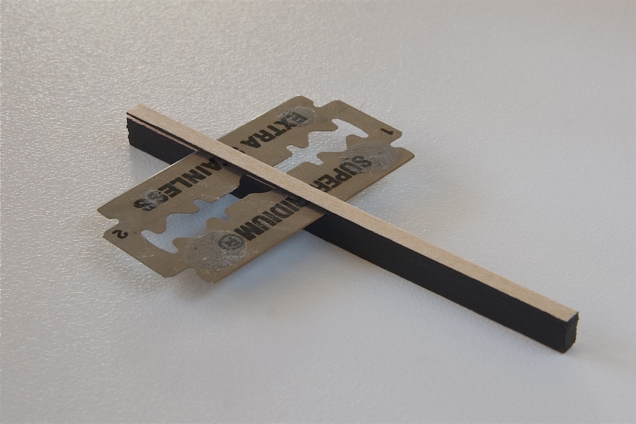 Przed wykonaniem ambrazur wstępnie przymocowałem pierwsze poszycie do kadłuba za pomocą taśmy malarskiej i zaznaczyłem na listewkach pozycję otworów. Następnie listewki rozcinałem na odcinki odpowiedniej długości tak, aby mieściły się pomiędzy wręgami.