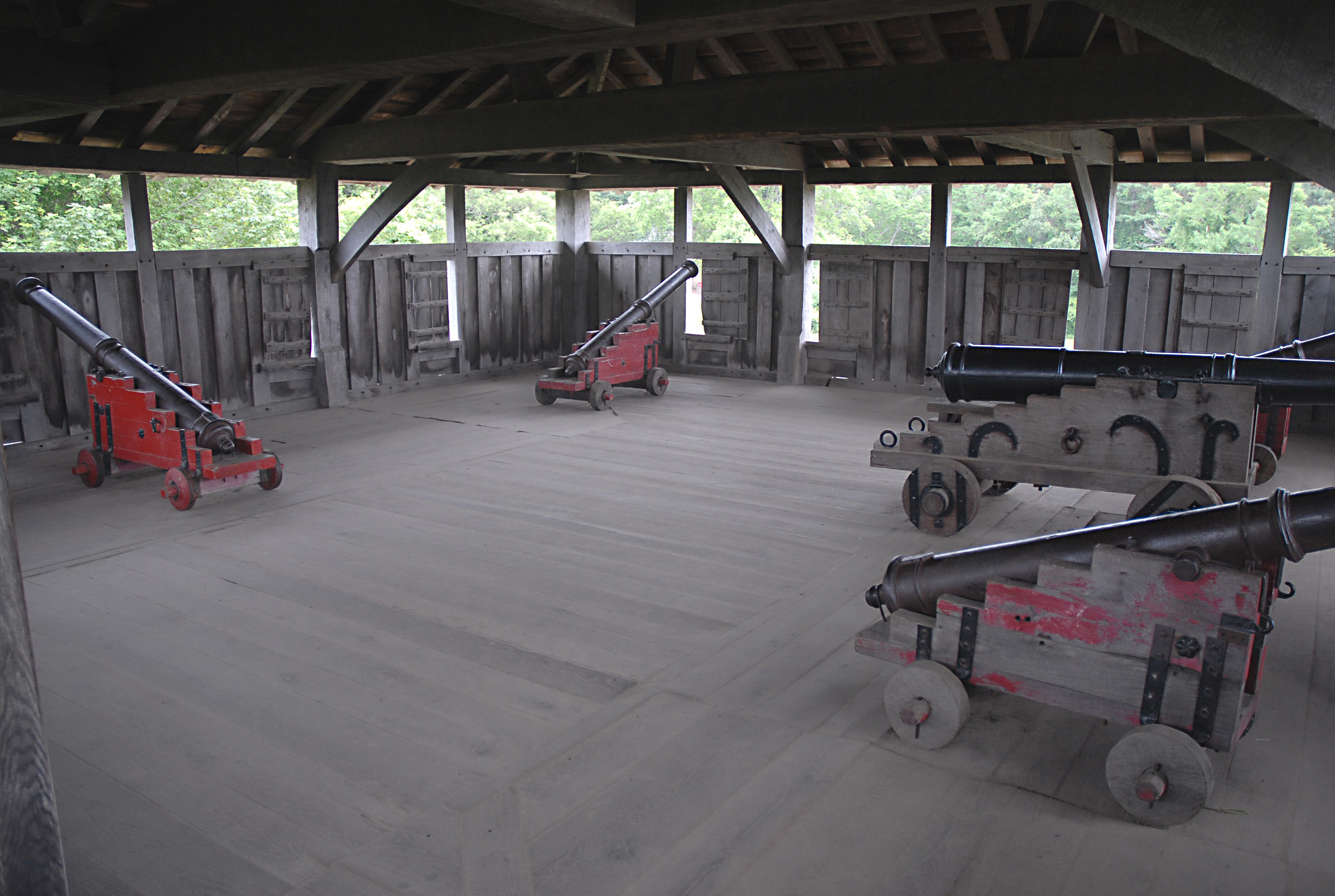 ...The Pilgrims had brought with them several different varieties of cannons, which they hauled up to the second story of the fort and mounted in a way that could command the whole harbor. The largest was a minion cannon, which was brass, weighed about 1200 pounds, and could shoot a 3.5 pound cannonball nearly a mile. They also had a shaker cannon of about 800 pounds, and two base cannons that were much smaller, perhaps about 200 pounds and which shot a 3 to 5 ounce ball. Various other gun ports in the fort could be opened and closed for the smaller cannon to be moved and pointed in any direction necessary...