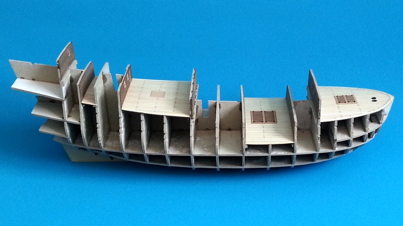 Udało mi się ostatnio dokończyć główny pokład i zamontować kilka gretingów. Pozostałe trzy pokłady zrobię w późniejszym etapie. Postanowiłem też że nie będę kołkował waterway'ów. Zostawiam je tak jak są.