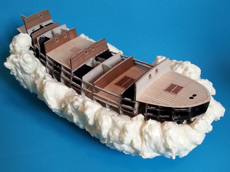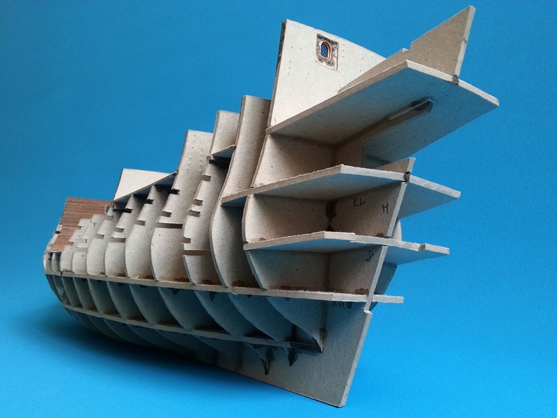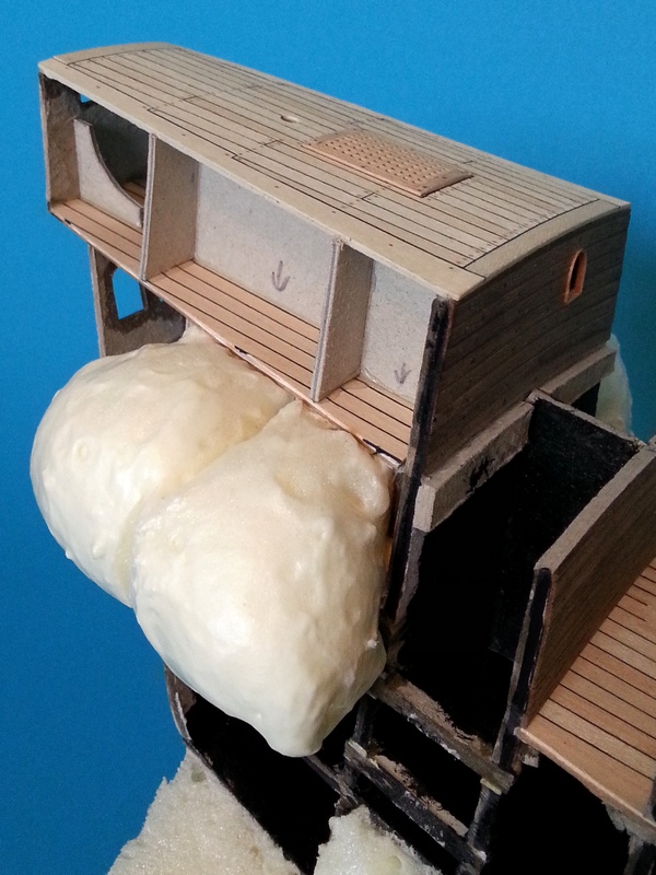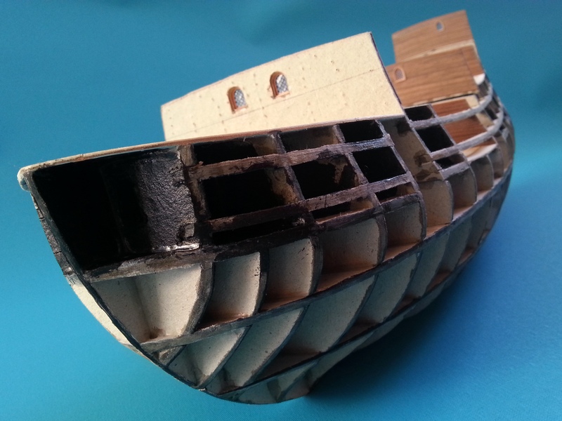 Dzięki woj195 za dobre słowo. Na razie nie obcinam pianki. Zrobię to tuż przed samym poszywaniem kadłuba żeby jej zawczasu nie powgniatać niepotrzebnie. Szkielet wydawał się solidny i sztywny więc zakładam że nie będzie tragedii. Okaże się później. Tymczasem dokończyłem konstrukcję kasztelu rufowego, zapiankowałem pozostałe przestrzenie między wręgami i dorobiłem jeden pokład.