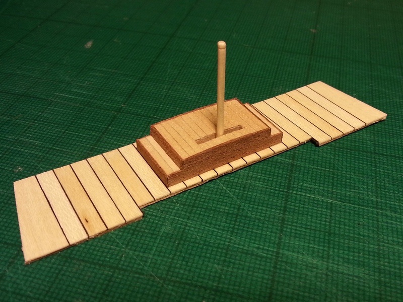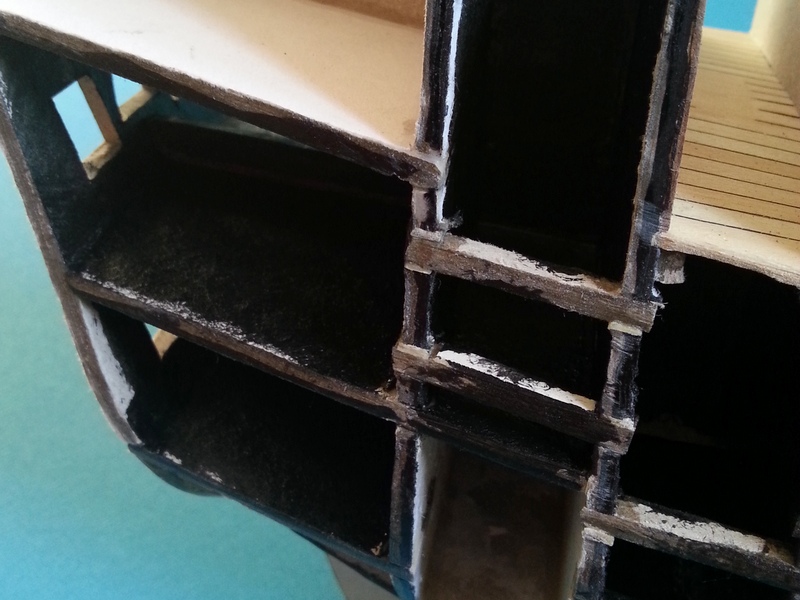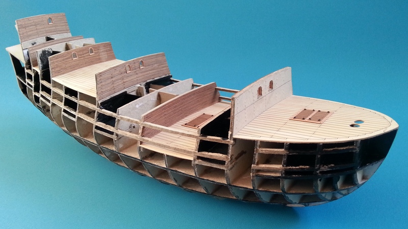 Pora na drobną aktualizację tematu. Za namową Jerrego postanowiłem, że jednak spróbuję zakołkować waterwaye. Przynajmniej częściowo, gdyż krawędzie pokładów zostaną jeszcze zakryte przez wewnętrzne poszycie burt i waterwaye się nieco zwężą ( poza pokładem dziobowym). W międzyczasie zrobiłem też miejsce pracy sternika, poskładałem szkielet do kupy i wyszło coś, co zaczyna przypominać galeon