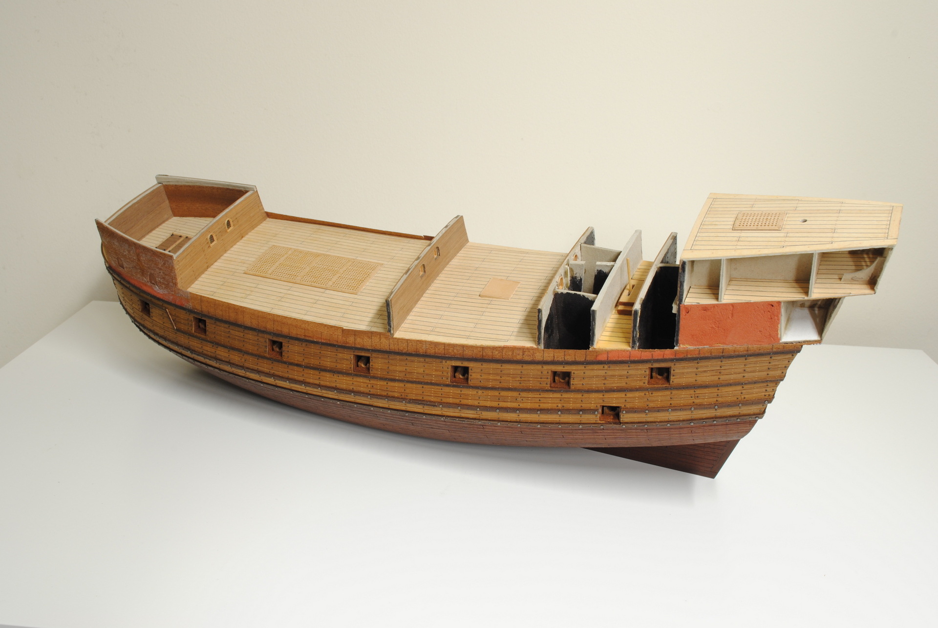 Chyba postawiłem sobie poprzeczkę nieco za wysoko i model mnie zwyczajnie przerósł. Udało mi się jedynie skończyć poszycie denne i nadać mu nieco koloru. Od tamtego momentu moją uwagę zajęły inne, mniejsze projekty, a obecnie kartonówki. Forum jednak ciągle podglądam i z ukrycia zachwycam się niesamowitymi modelami które tu powstają
