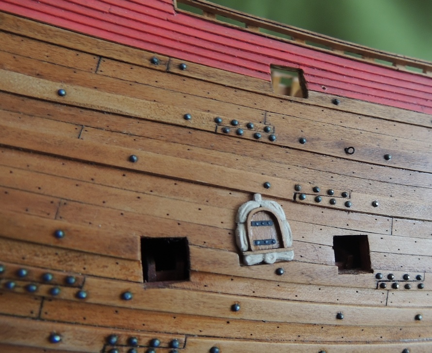 Już niewiele tych drobiazgów zostało mi do zrobienia. Przybyły schodki przy nadburciach, knagi nad ambrazurami, pałąk do poruszania sterem(nie mam pojęcia jak to się fachowo nazywa) i trochę okuć.