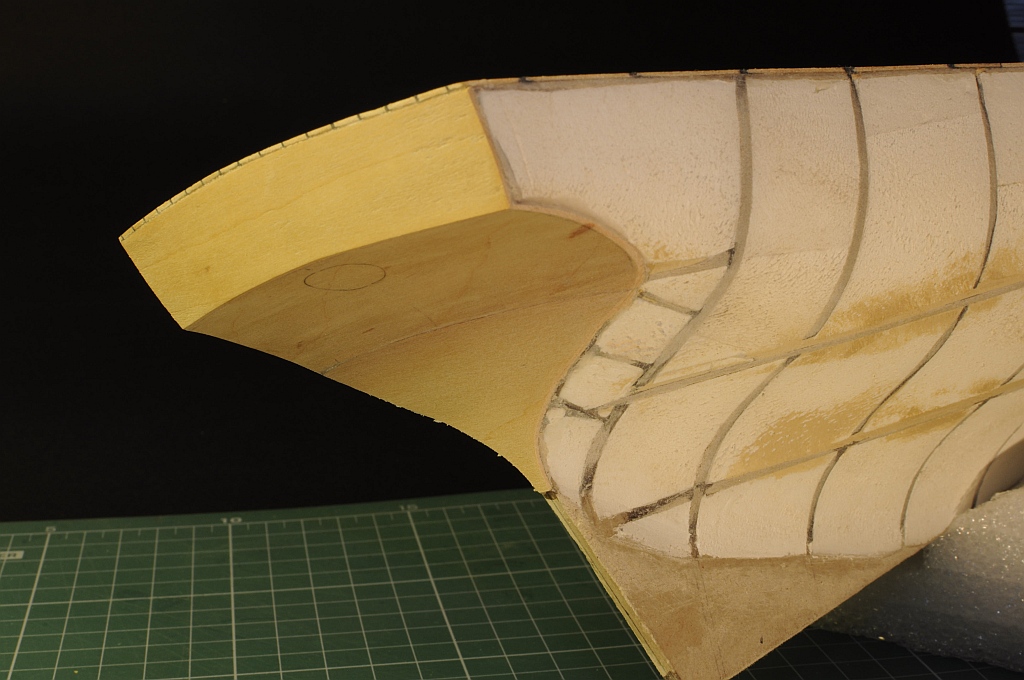 Kołkowanie pokładu wykałaczkami zostało ukończone (kilkaset sztuk!). Kadłub został pozbawiony tzw. „krowich żeber” papierem ściernym (gradacja 80). Celowo zastosowałem grubszy papier ścierny by uzyskać „głębokie” rysy na styrodurze. Ma to na celu lepsze trzymanie się kleju. Dodatkowo wypełniłem szpachlą puste miejsca szkieletu.