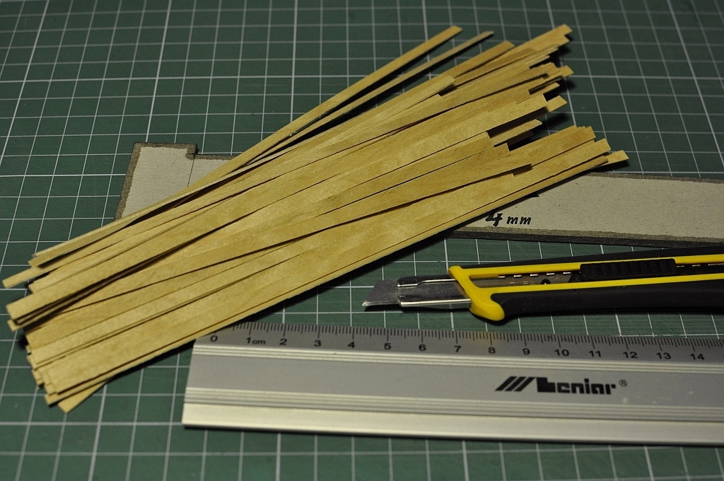Rozpocząłem deskowanie pokładu fornirem (fornir brzozowy). Deseczki szer. 4 mm z wklejonym czarnym kartonem 0,2 mm. Układ deskowania zgodny z planami Shipyard.
