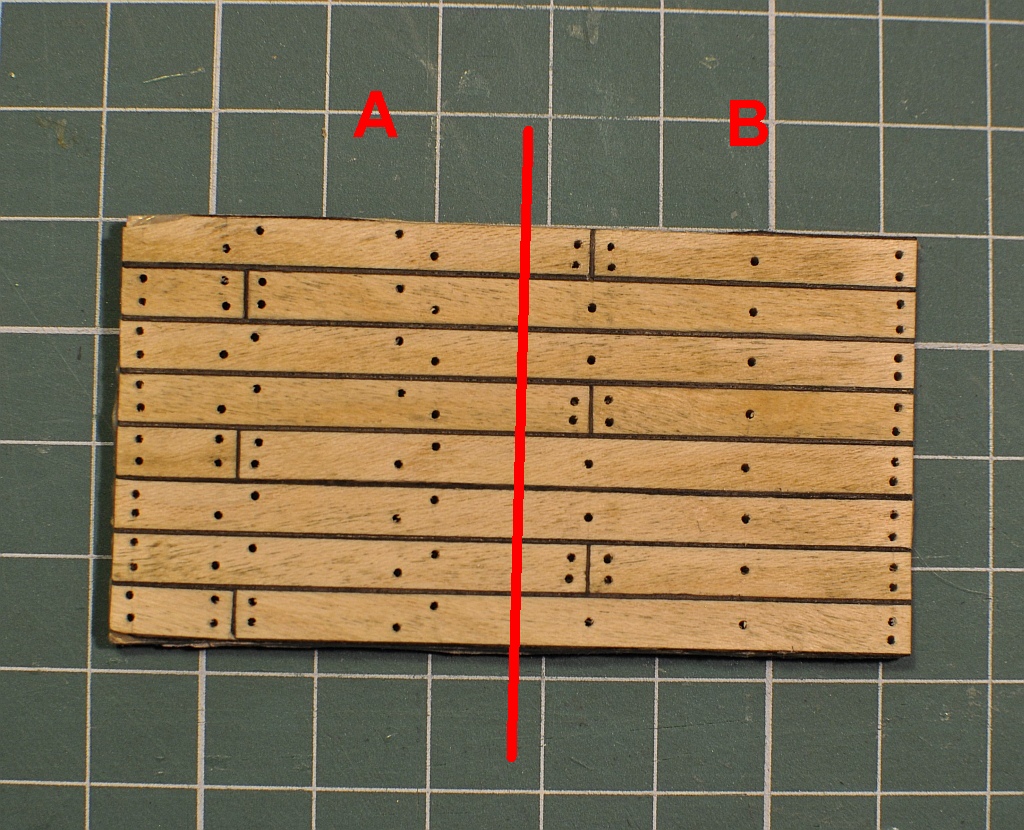Ukończyłem deskowanie pokładu. Pokład został przeszlifowany papierem ściernym a następnie zgrubnie cyklinowany nożykiem. Ostateczne cyklinowanie wykonam po zakołkowaniu pokładu i tutaj mam pytanie dotyczący układu kołków. Shipyard zastosował kołkowanie takie jak na ostatniej fotografii – oznaczyłem je literą „B”. Ja zastanawiam się czy nie lepiej wykonać takie jak po lewej – oznaczone literą „A”. Proszę o pomoc, który ze sposobów jest lepszy?