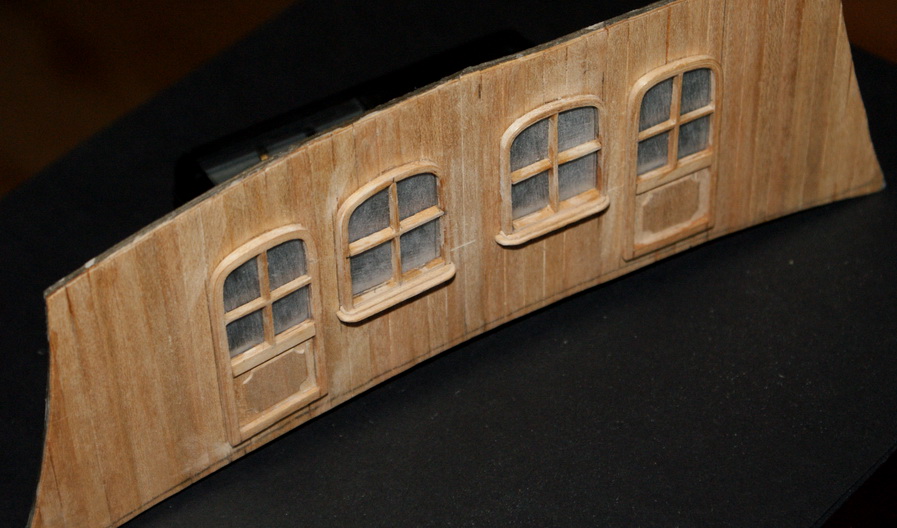 Gabaryty ścianki są z naddatkami na dopasowanie do kadłuba. Okna i drzwi wklejone kropelką patexu. Całość wymaga jeszcze dopieszczenia