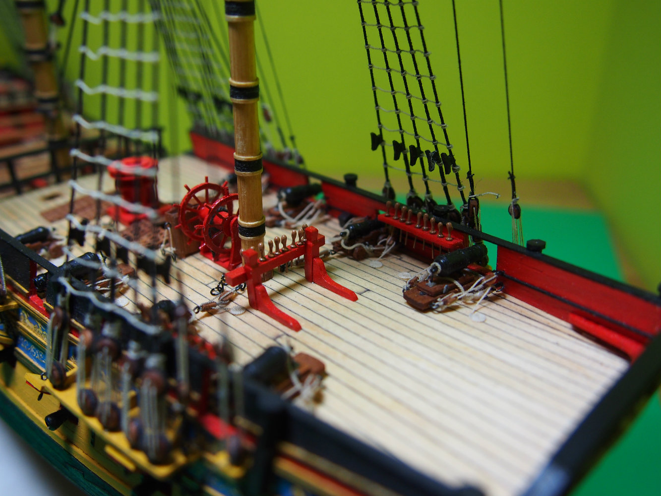 Widzę, że mocno popędziłeś z budową. Olinowanie wygląda super. Ja kończę montować artylerię i też zabiorę się za maszty i olinowanie. Będę mógł podpatrzeć co nieco u Ciebie bo przecież nasze modele są podobne.