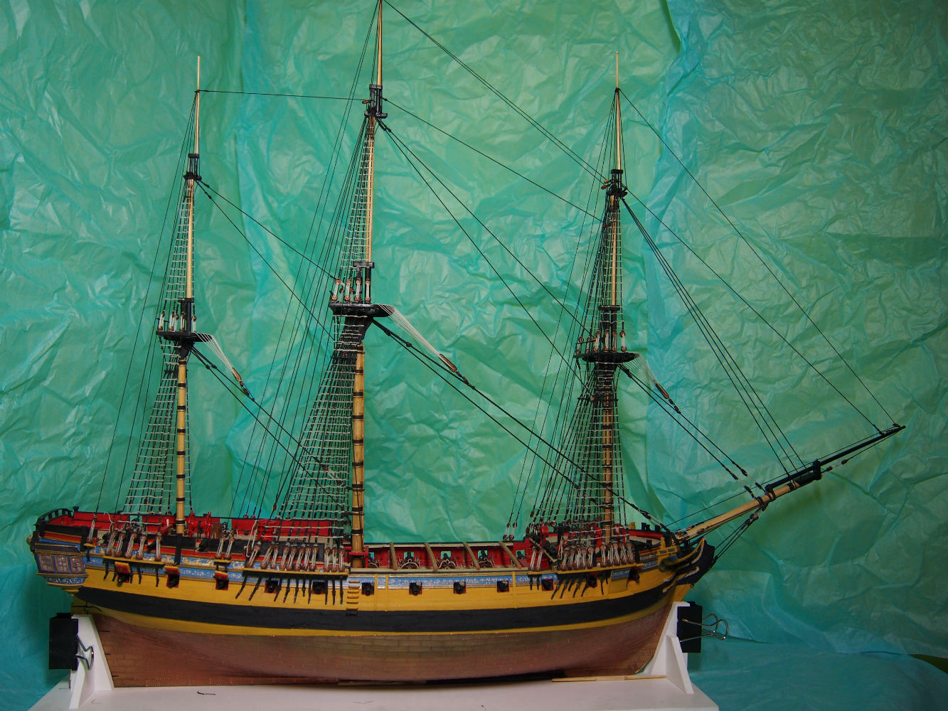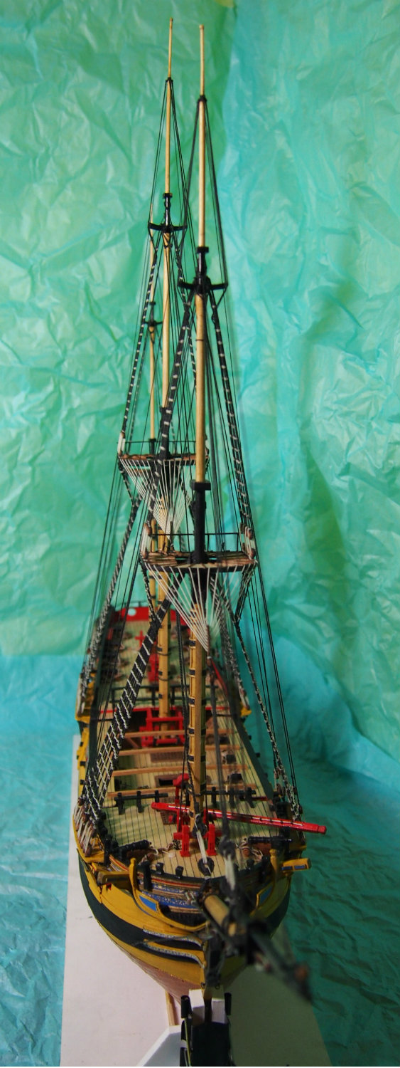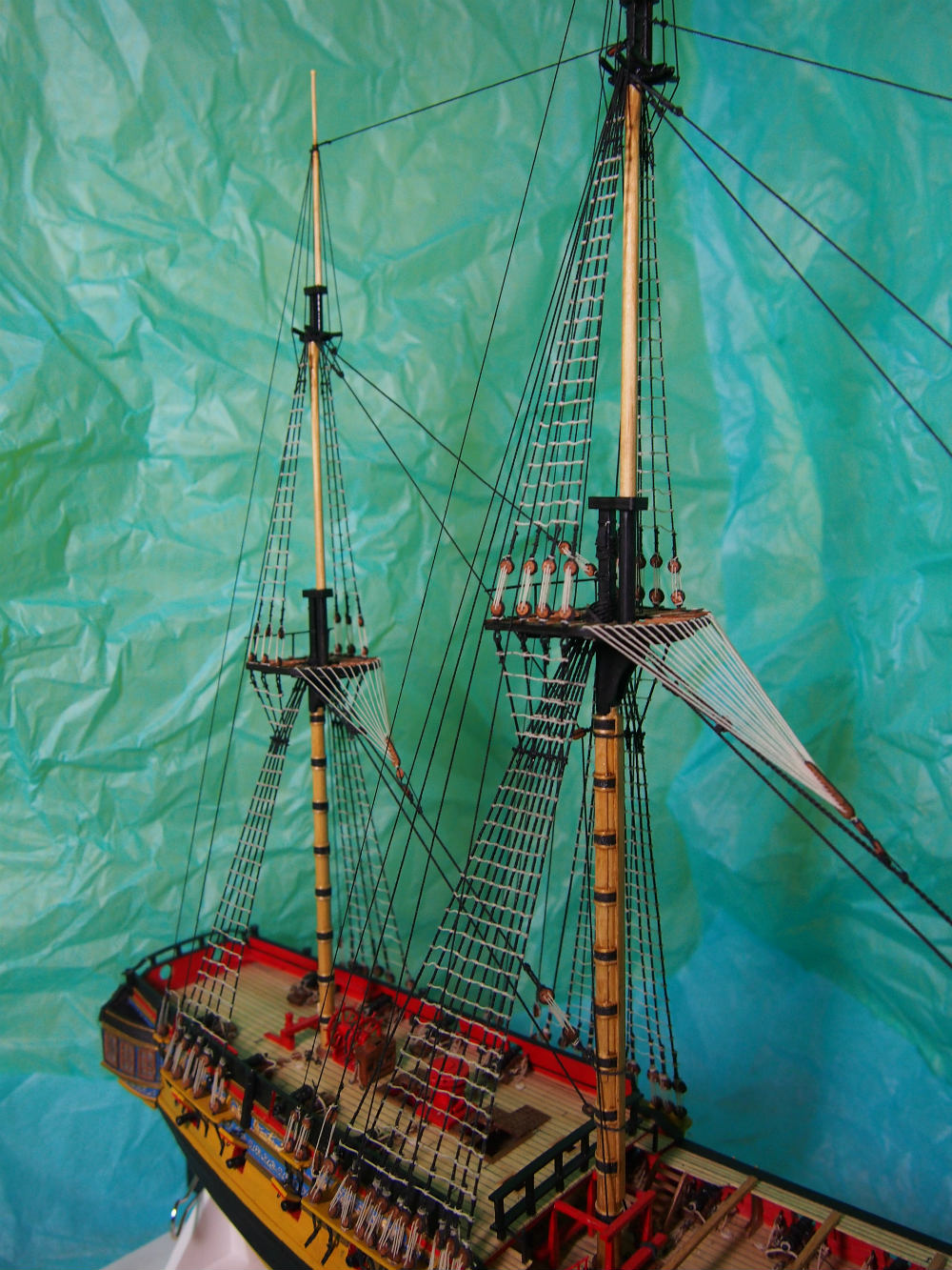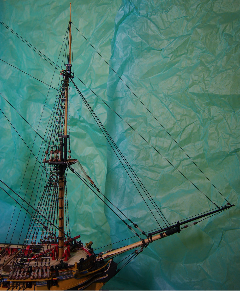 Widzę, że mocno popędziłeś z budową. Olinowanie wygląda super. Ja kończę montować artylerię i też zabiorę się za maszty i olinowanie. Będę mógł podpatrzeć co nieco u Ciebie bo przecież nasze modele są podobne.