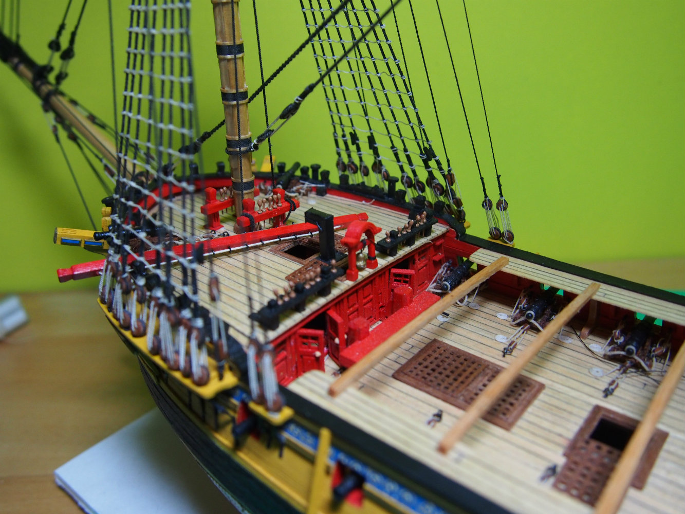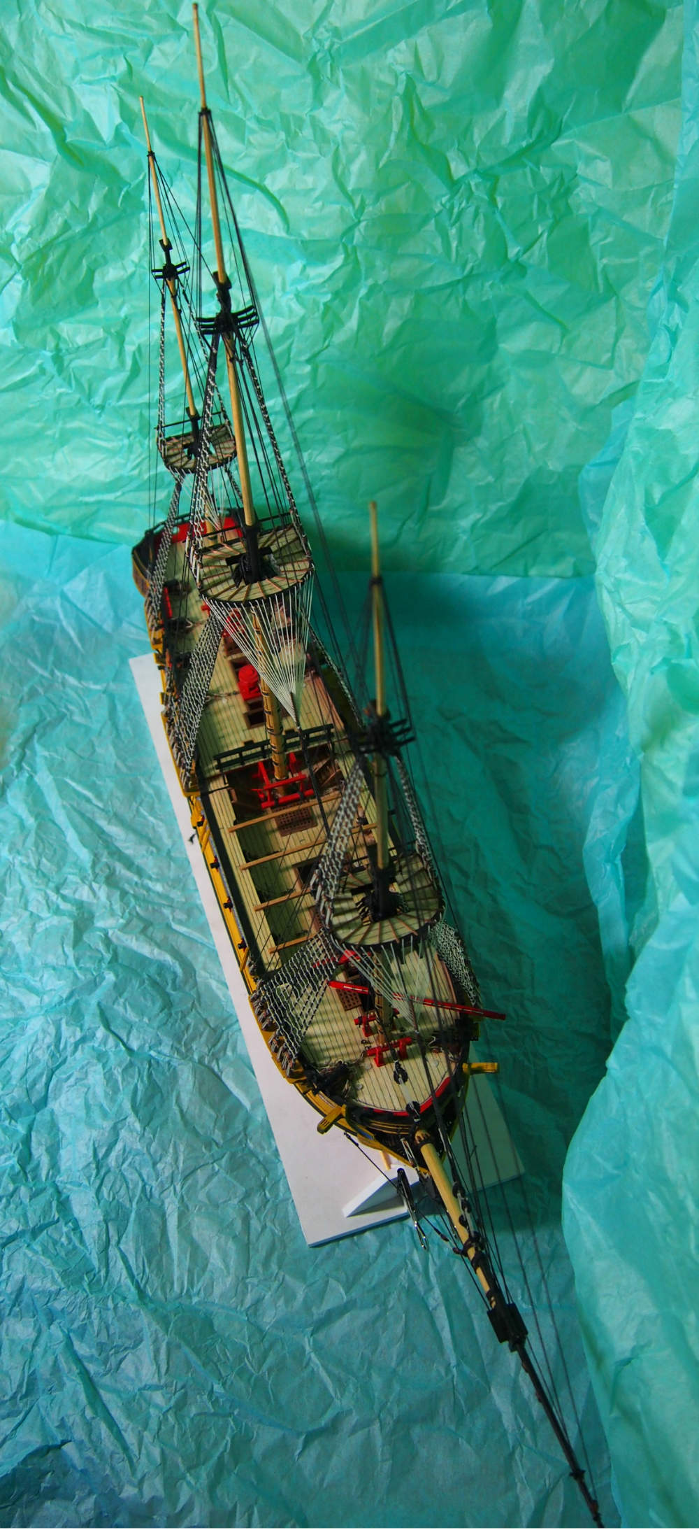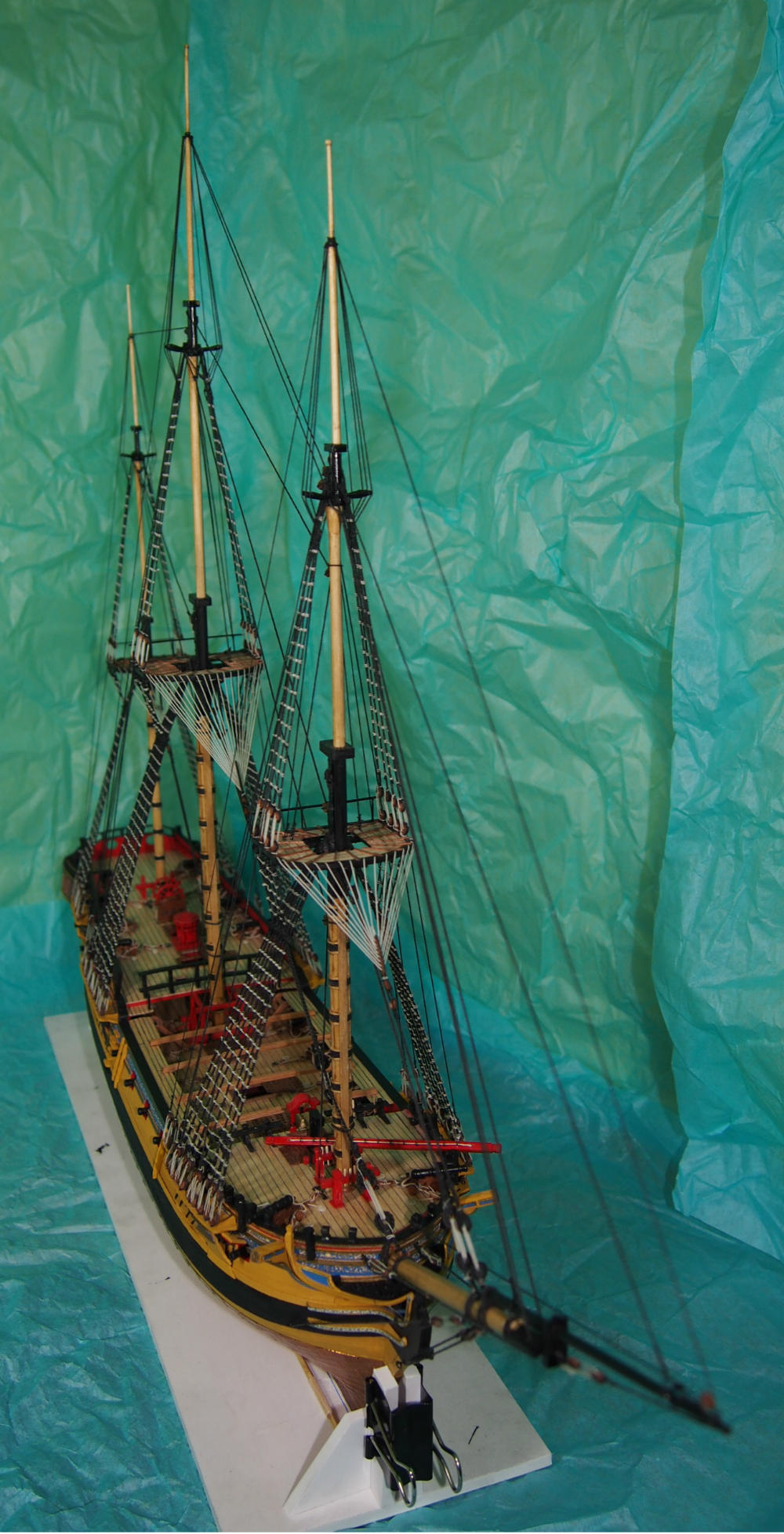 Widzę, że mocno popędziłeś z budową. Olinowanie wygląda super. Ja kończę montować artylerię i też zabiorę się za maszty i olinowanie. Będę mógł podpatrzeć co nieco u Ciebie bo przecież nasze modele są podobne.