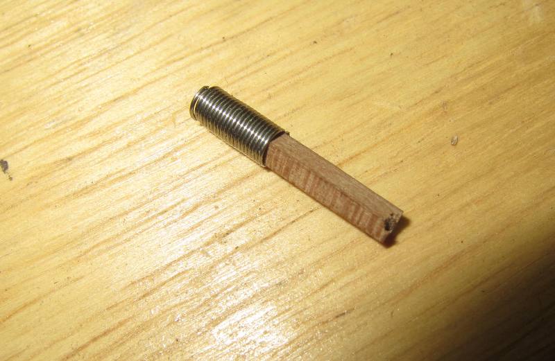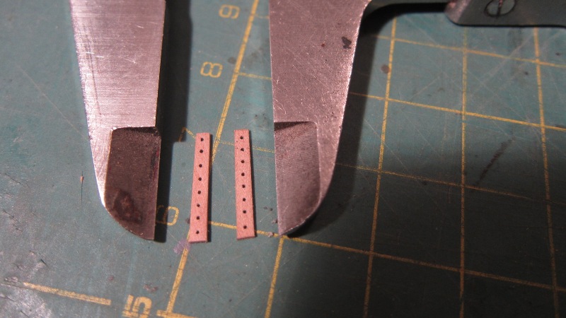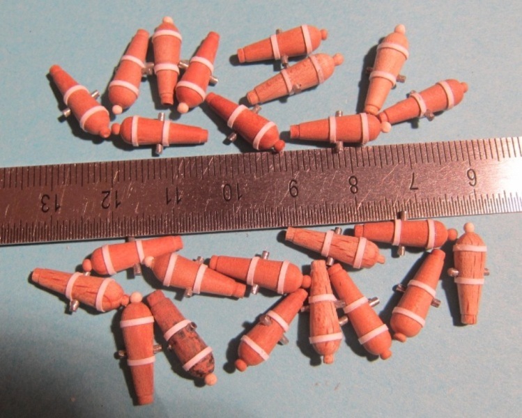 Przybyło patyczków. Wszystkie z gruszy, bardzo dobrze się obrabia i nie zostawia włosków. Reje, z uwagi na wymiary i możliwości mojego warsztatu – wykonałem jako dwudzielne; listewki kwadratowe, o długości ze sporym zapasem, przy użyciu ośmiokątnego szablonu obrobiłem pilnikiem na ośmiokąt. Następnie, znaną wszystkim metodą, używając wiertarki, papieru ściernego i iglaków, obrobiłem każdą połówkę do żądanego kształtu i wymiarów. Połówki zostały sklejone „do czoła”, a spoinę wzmocniły nakładki na środkowym, ośmiokątnym segmencie rei. Niestety bloków w nokach rei nie udało się umieścić, muszą wystarczyć profilowane otworki.