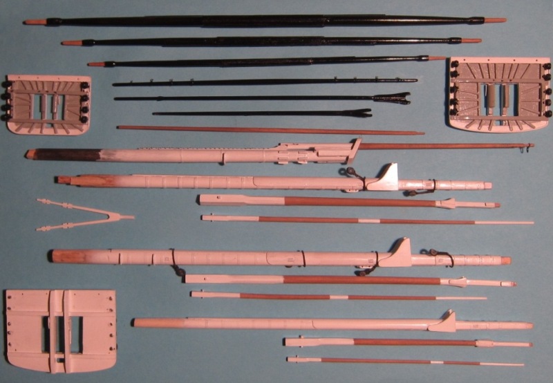 Przybyło patyczków. Wszystkie z gruszy, bardzo dobrze się obrabia i nie zostawia włosków. Reje, z uwagi na wymiary i możliwości mojego warsztatu – wykonałem jako dwudzielne; listewki kwadratowe, o długości ze sporym zapasem, przy użyciu ośmiokątnego szablonu obrobiłem pilnikiem na ośmiokąt. Następnie, znaną wszystkim metodą, używając wiertarki, papieru ściernego i iglaków, obrobiłem każdą połówkę do żądanego kształtu i wymiarów. Połówki zostały sklejone „do czoła”, a spoinę wzmocniły nakładki na środkowym, ośmiokątnym segmencie rei. Niestety bloków w nokach rei nie udało się umieścić, muszą wystarczyć profilowane otworki.