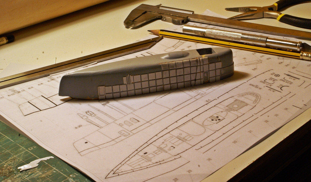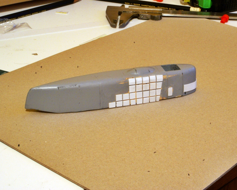 Te kwadraciki z polistyrenu będą się Tobie śniły po nocy Wojtek bo jak będziesz tez obklejał kadłub nimi to będzie pewnie ponad 1000 lub więcej ale przynajmniej Model będzie się lepiej prezentował i na pewno na tym zyska.