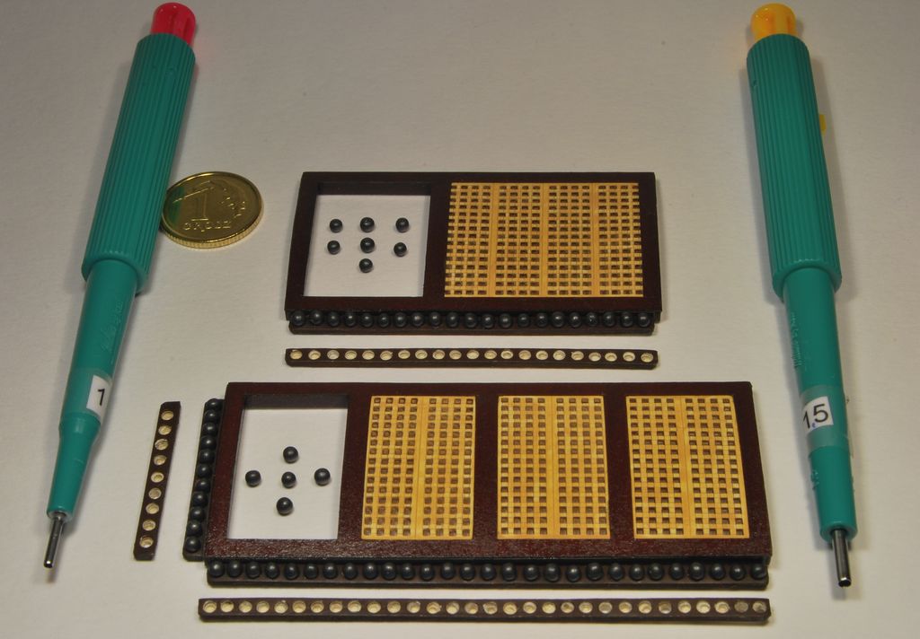 Zwróć uwagę, że listwy z kulami - przy dłuższych bokach - są "przerywane". W owych przerwach będą zamieszczone kolucha do mocowania talii wyciągających lawety. Wyznaczyłem je patrząc po prostu w otwór lawety od strony burty i nanosiłem punkt w osi symetrii lawety.
