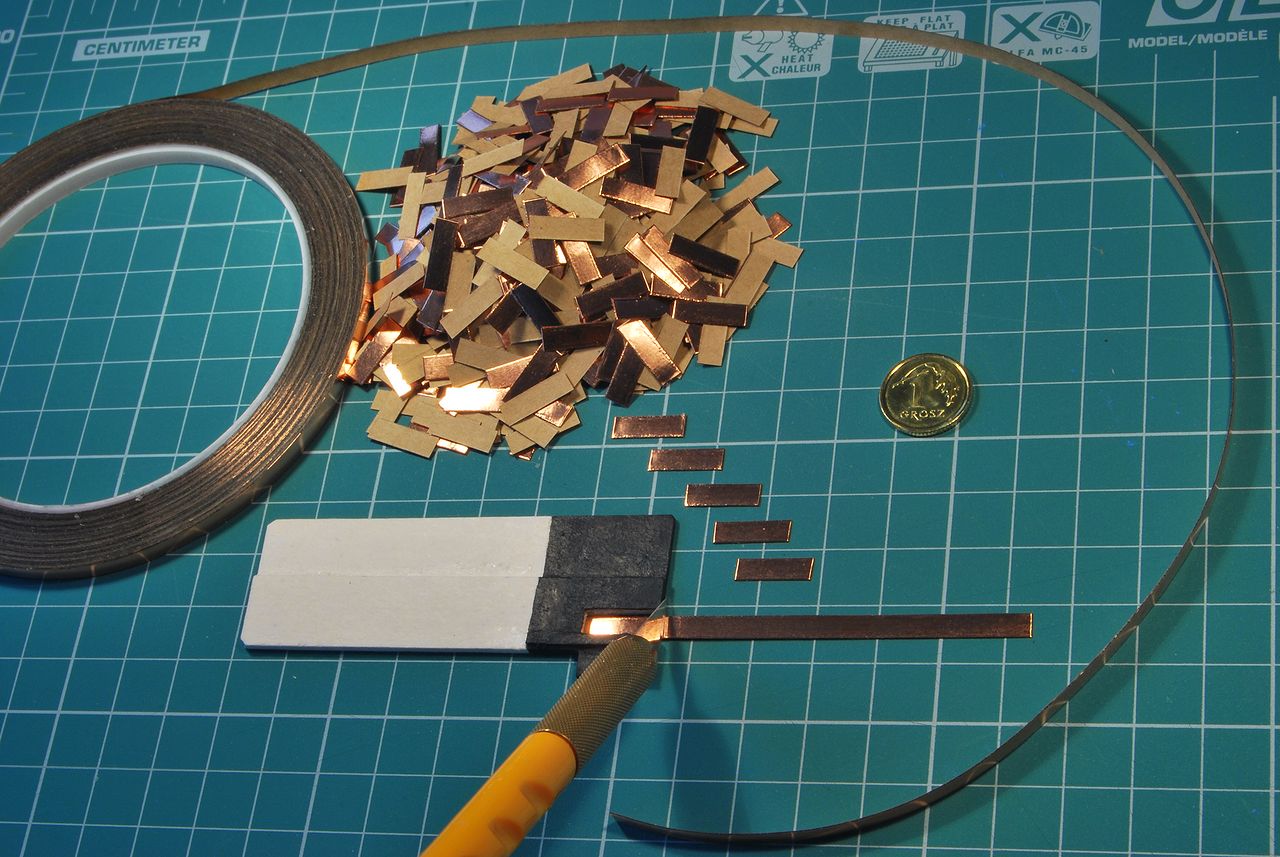 Ja postępuję zupełnie podobnie z tym, że moja taśma ma czarną powłokę klejową, która mocno trzyma. Dlatego oddzielam papierek krawędzią ostrza, to pomaga zapobiec zagięciu płytki. Niestety, muszę trafić między papier i taśmę, a ten "wymiar" ma grubo mniej niż 0,1 mm ;)