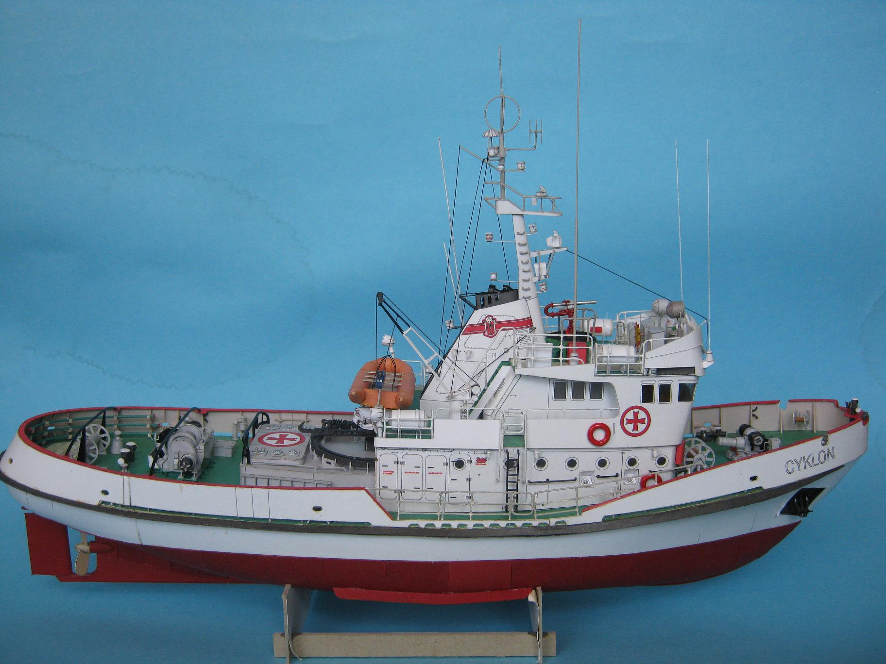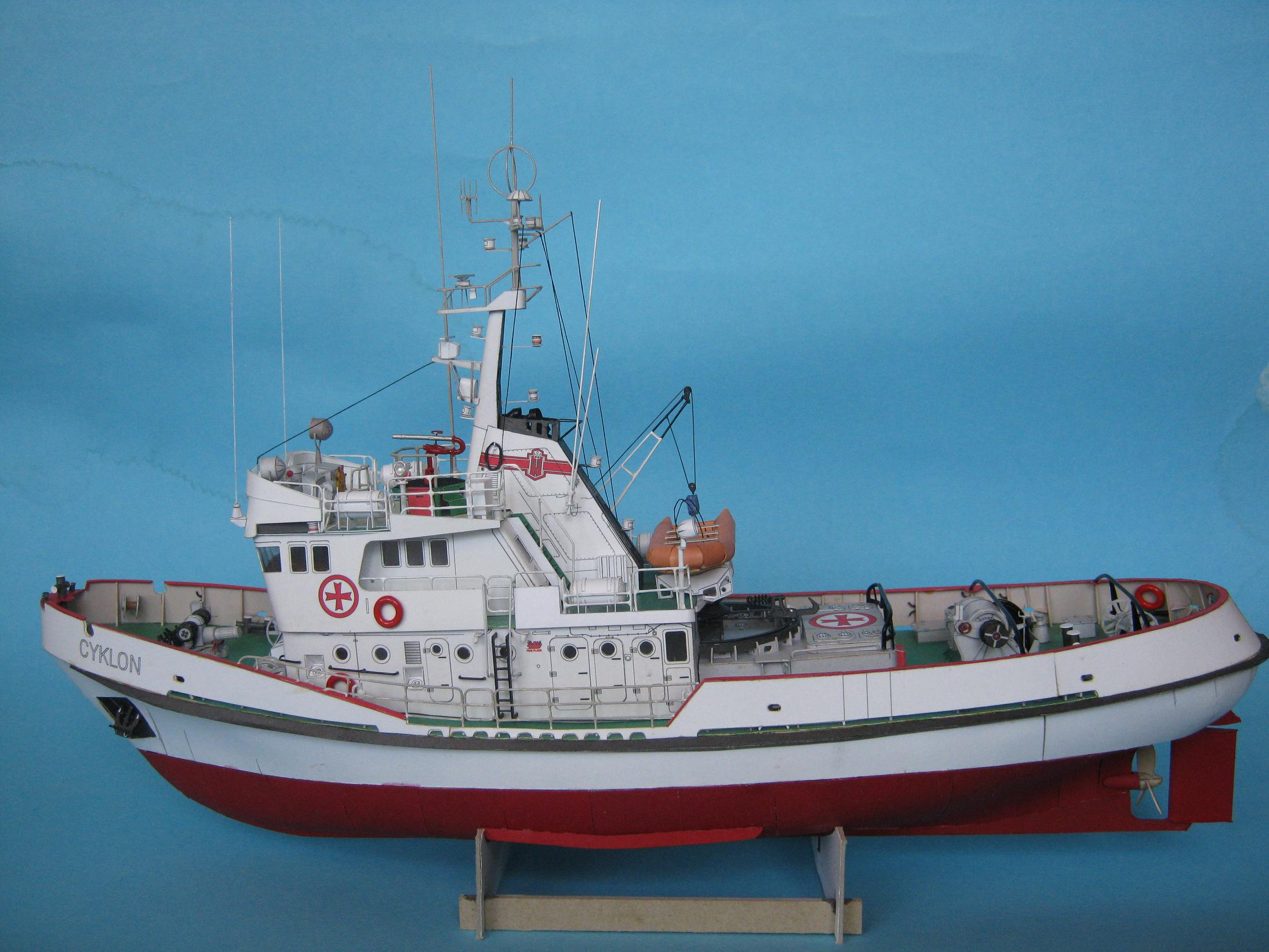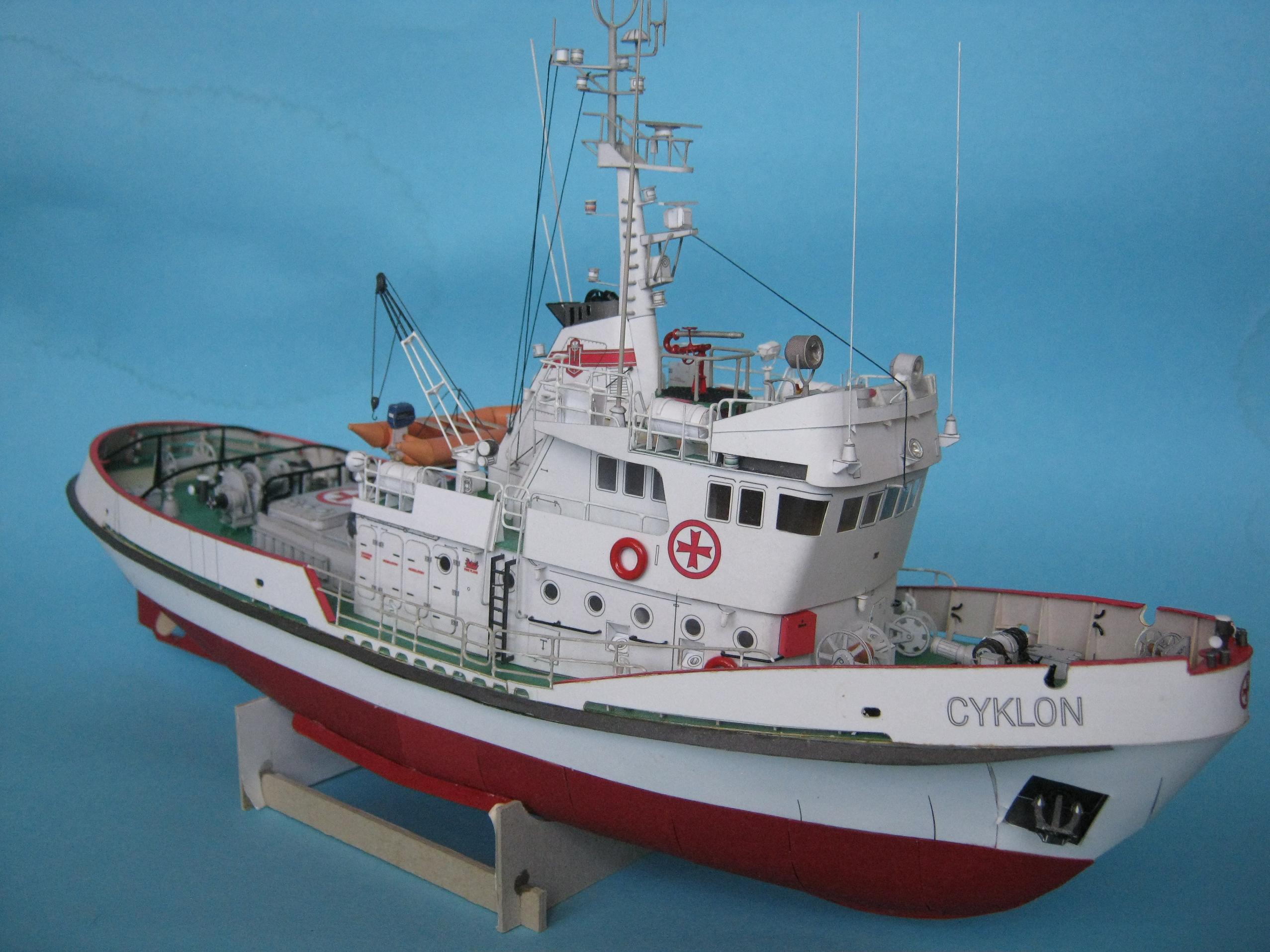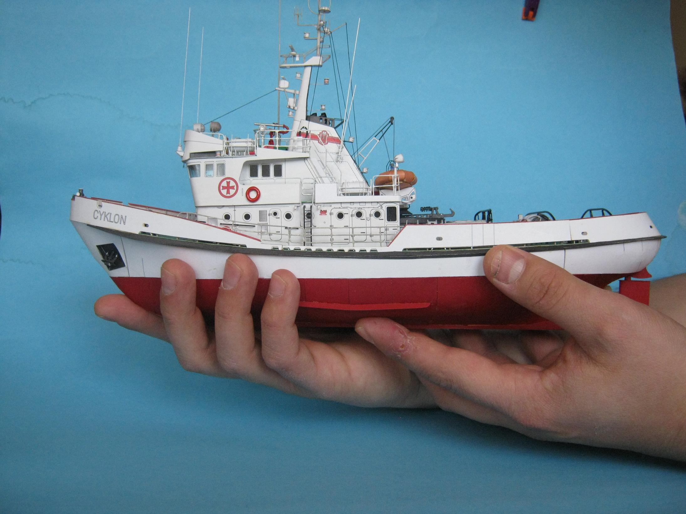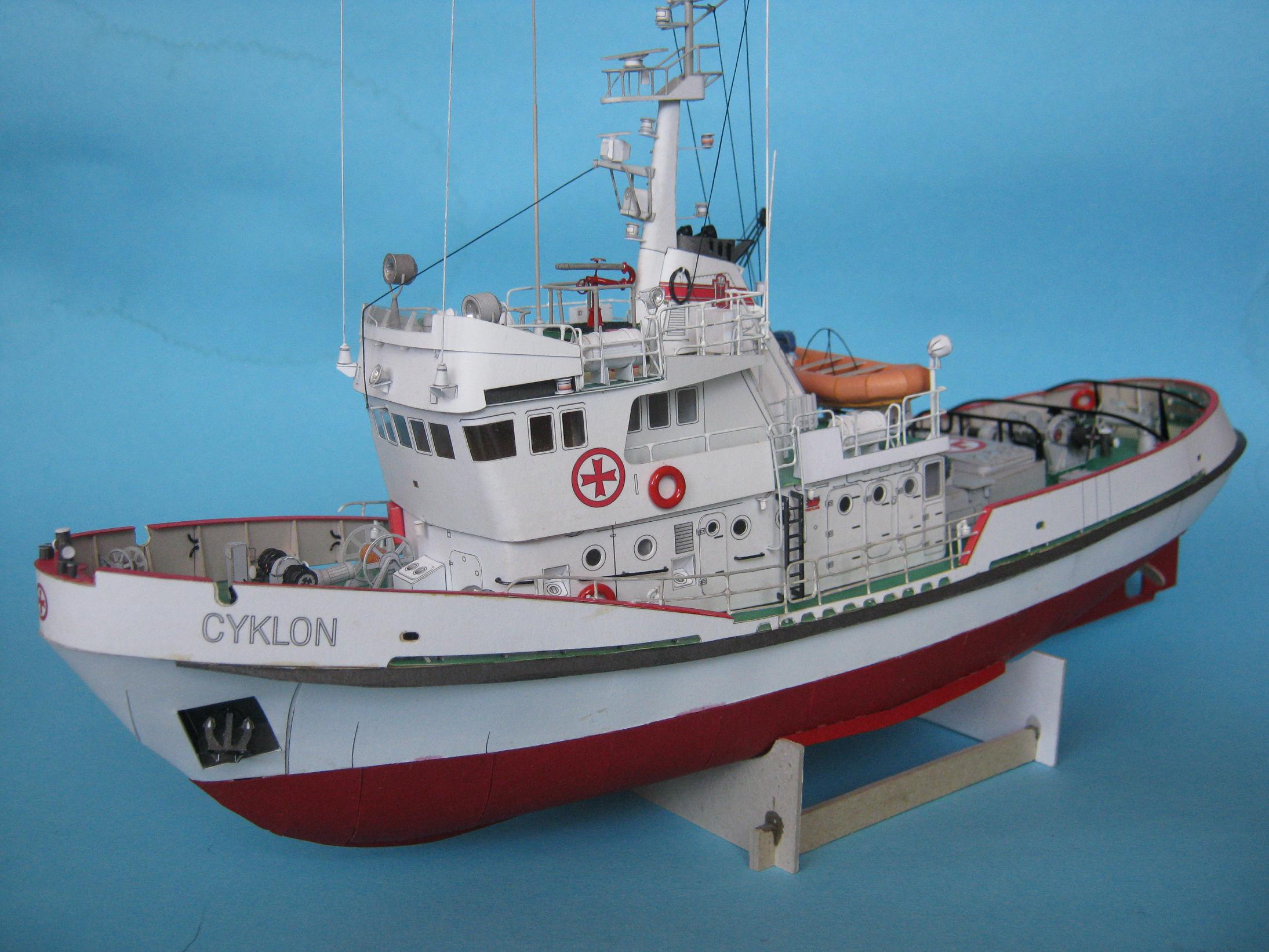 Przemek. Powstał piękny modelik. Zważywszy na wielkość porównywalną do łupinki od orzecha, te wady poszycia o których piszesz nie są dramatyczne. Moim zdaniem bardzo zgrabnie wyprofilowałeś zwłaszcza rufę. Szkoda, że jeszcze bardziej nie uplastyczniłeś modelu np. nawijając liny lub przewody na kołowroty, wycinając otwory wentylacyjne i wykonując w nich żaluzje. Niemniej jednak i bez tych kilku detali Cyklonek wygląda świetnie. Skoro jednak pokazałeś, że potrafisz bawić się z kartonem, to w przyszłym Twoim modelu nie będzie już tak łatwo i będziesz musiał coś dodać od siebie; sam sobie podniosłeś poprzeczkę to teraz cierp