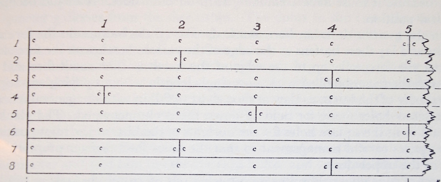 To i ja dorzucę co nieco do tego "pokładowego ogródka". Wg Longridge'a planki pokładu miały wielkość od 18 do 20 stóp i układane były w układzie czterostopniowym tzn. pomiędzy dwiema plankami, których skrajne krawędzie znajdują się w tej samej linii (na załączonym rysunku są to planki oznaczone numerami 1 i 6), są ułożone cztery dodatkowe planki. Myślę, że dobrą długością deski jest przyjęcie wartości 60 mm, co mniej więcej dla skali tego modelu odpowiada długości 20 stóp. Deskę o takiej długości dobrze dzieli się na równych pięć odcinków, które pozwalają na zachowanie czterostopniowego układu planek.