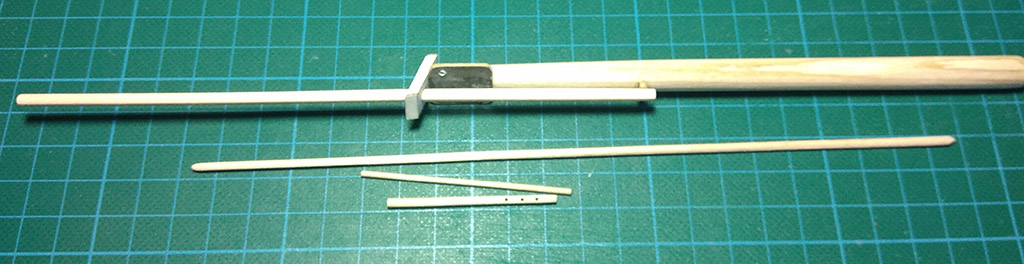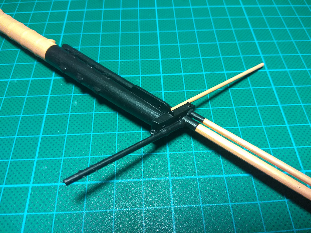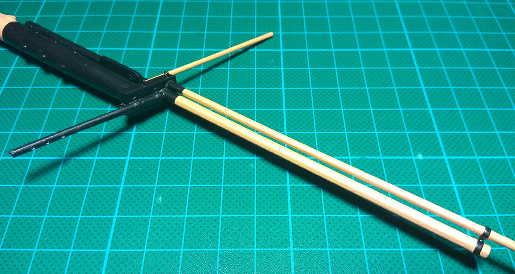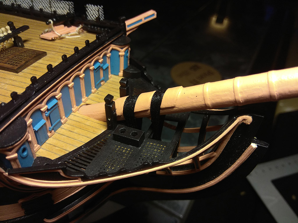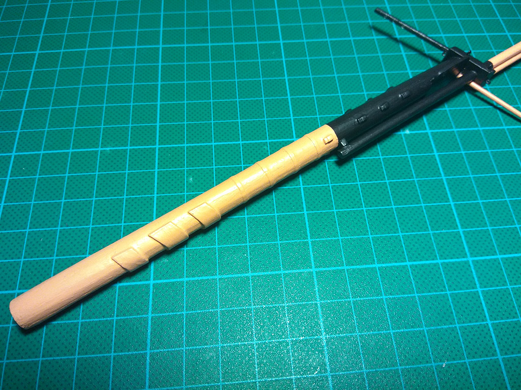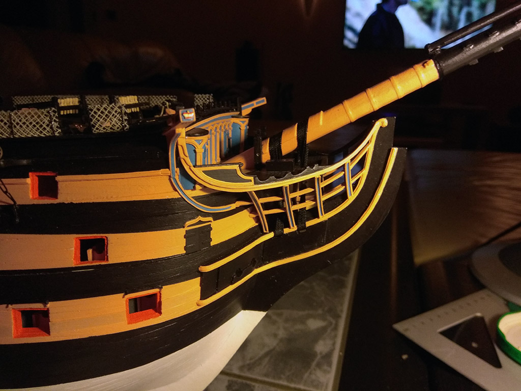 Bukszpryt umieszczony na swoim miejscu, wykonałem również podwójny przewiąz, oraz wkleiłem 2 pachołki