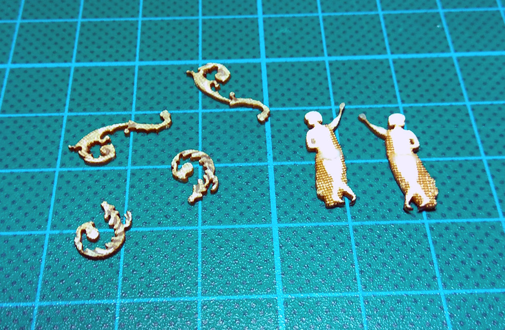 Teraz przygotowanie pozostałych ornamentów galionu. Te miałem wycinane laserowo, ale trzeba je było uplastycznić wikolem