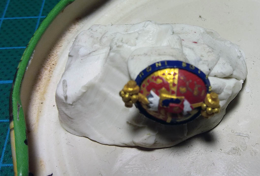 Z literek 1mm wykonałem napis na obwodzie tarczy: HONI SOIT QUI MAL Y PENSE (fr. Hańba temu, kto widzi w tym coś nieprzystojnego) - dewiza Orderu Podwiązki.