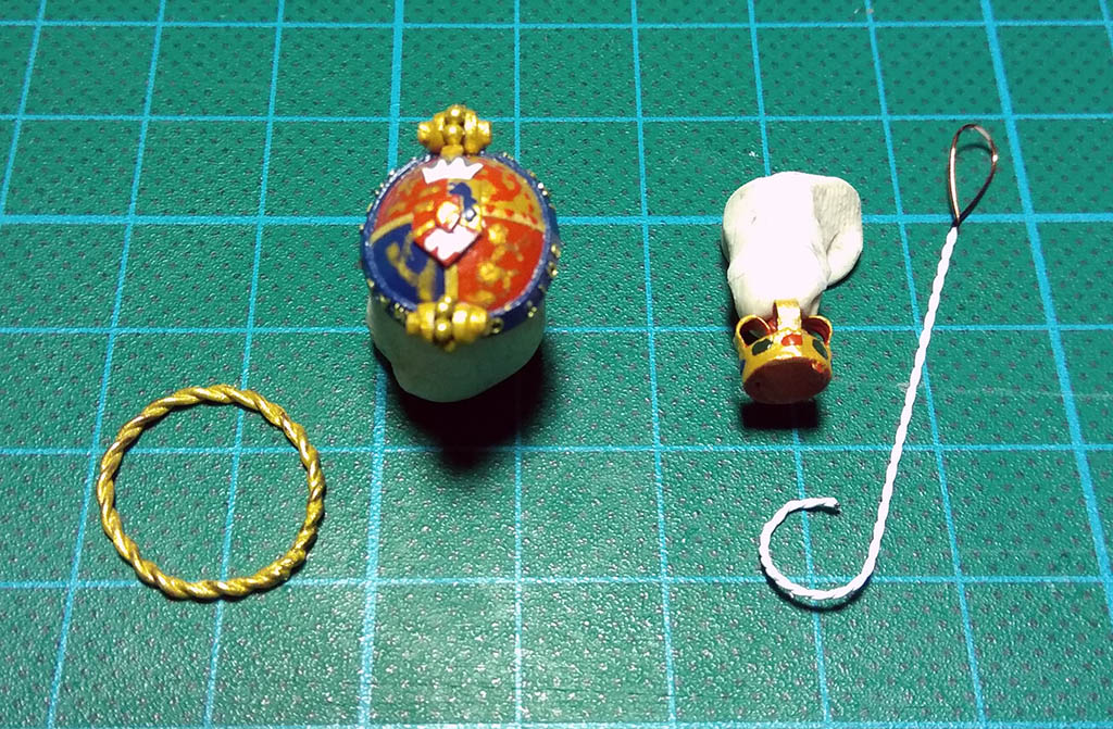 Korona pomalowana, kolej na ornamenty końcowe. Wykonałem je ze skręconego drutu miedzianego, który potem opaliłem by zrobił się miękki