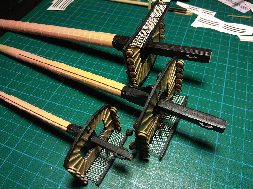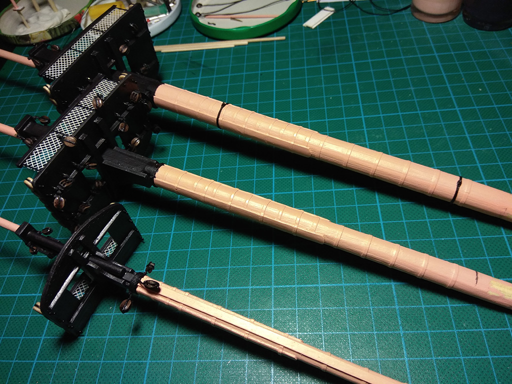 i zamocowałem na marsach. Wiem, że bloczki na spodniej części powinny być mocowane liną przechodzącą przez pokład marsa i na górze zabezpieczone kołkiem - ale w tej skali byłoby to trudno zrobić, więc zdecydowałem się na oczka
