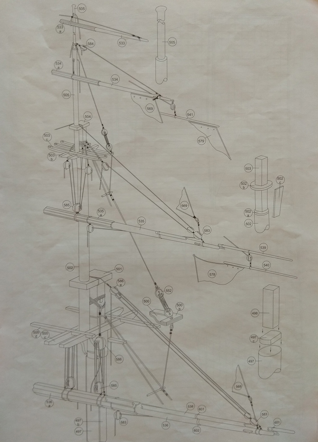 I tutaj ma pytanie do wszystkich znawców Viktorka. Shipyard na swoich rysunkach umieścił 4 reje i 4 żagle na fokmaszcie i grotmaszcie, a wydaje mi się, że powinny być 3 reje