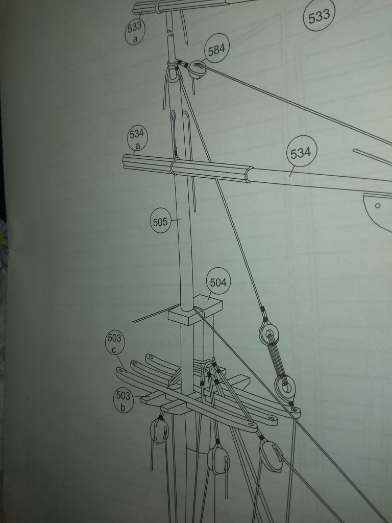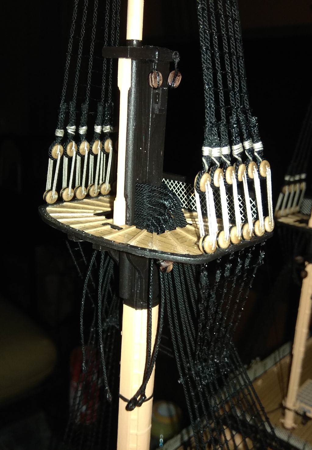 Pozostały do umocowania rozpórki podwantkowe do zamocowania want trzeciego piętra. Ale nim zamocuję wanty chciałbym się upewnić co do ich mocowania. Na rysunku w Shipyardzie wanty są mocowane do salingu za pomocą jufersów a'la sercowych - czy tak to wykonać, czy wanta ma wprost przechodzić przez otwór w salingu do rozpórki podwantkowej ?