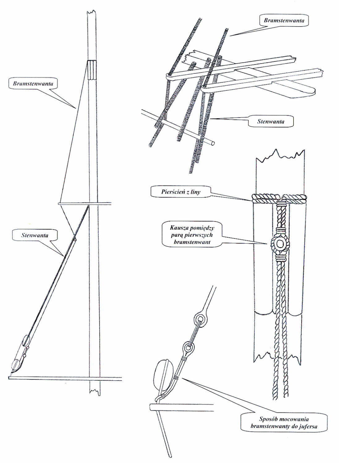 4) Bramstenwanty są mocowane przewiązem do pierwszej, trzeciej i piątej obejmy jufersa (na foku i grocie) oraz do pierwszej i trzeciej na bezanie.