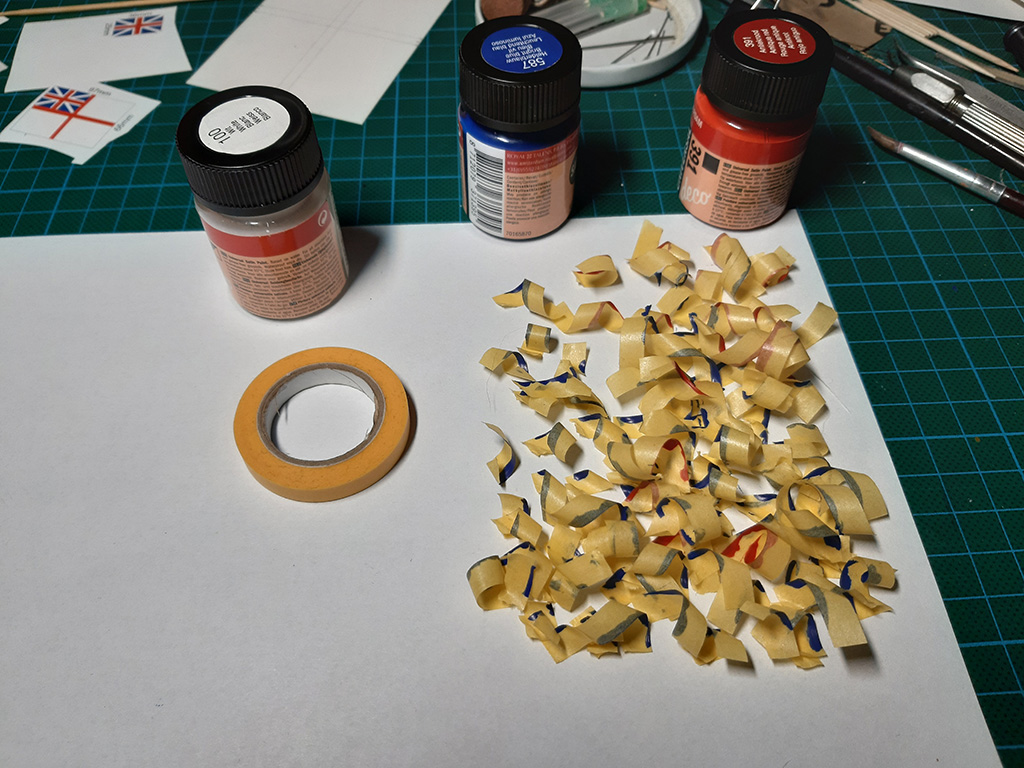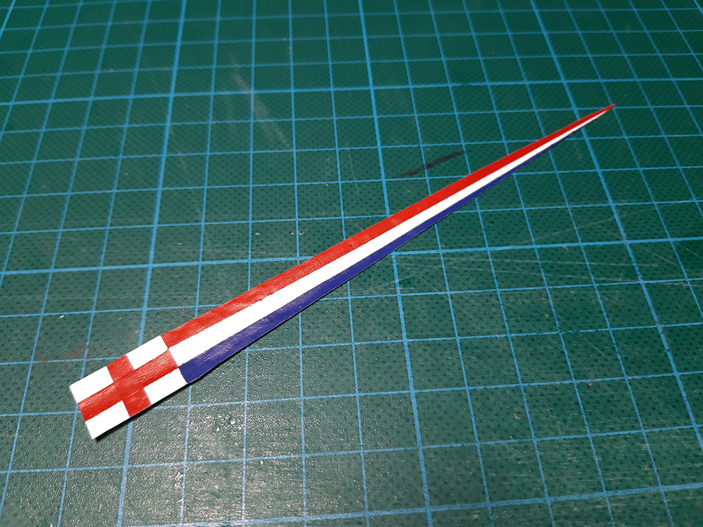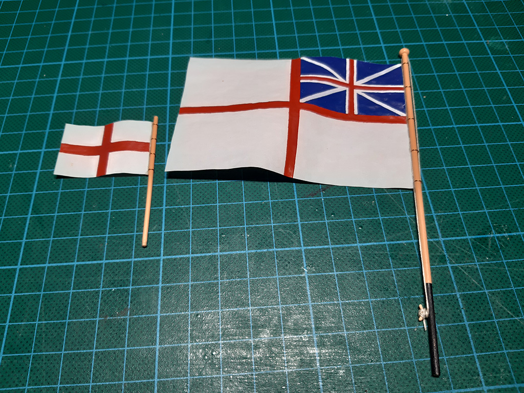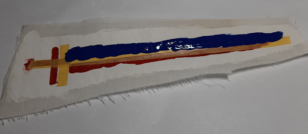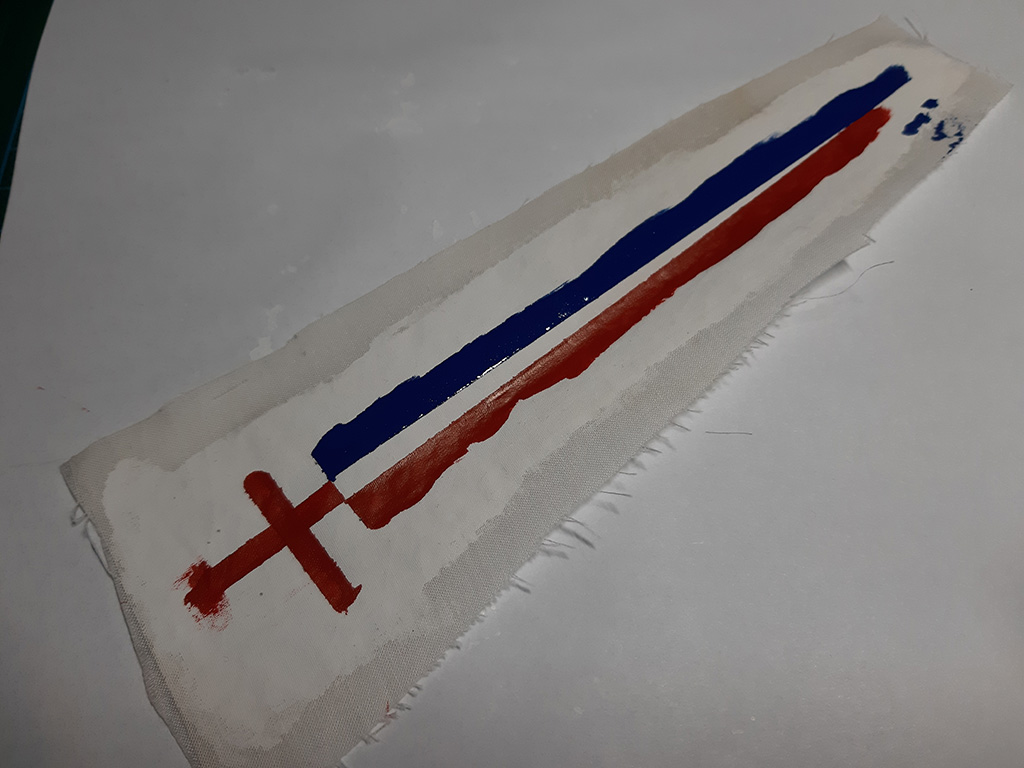 Zacząłem pracę przy banderach, zdecydowałem sie na bandery malowane ręcznie na batyście. Batyst pomalowałem białym Talensem. Potem malowanie