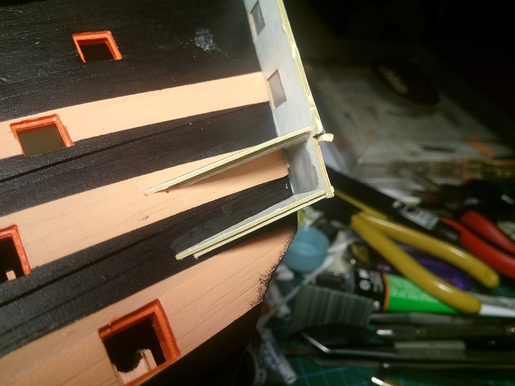 Przykleiłem teraz rzeźbę, bo później trudno by było wygiąć ją do kształtu rufy