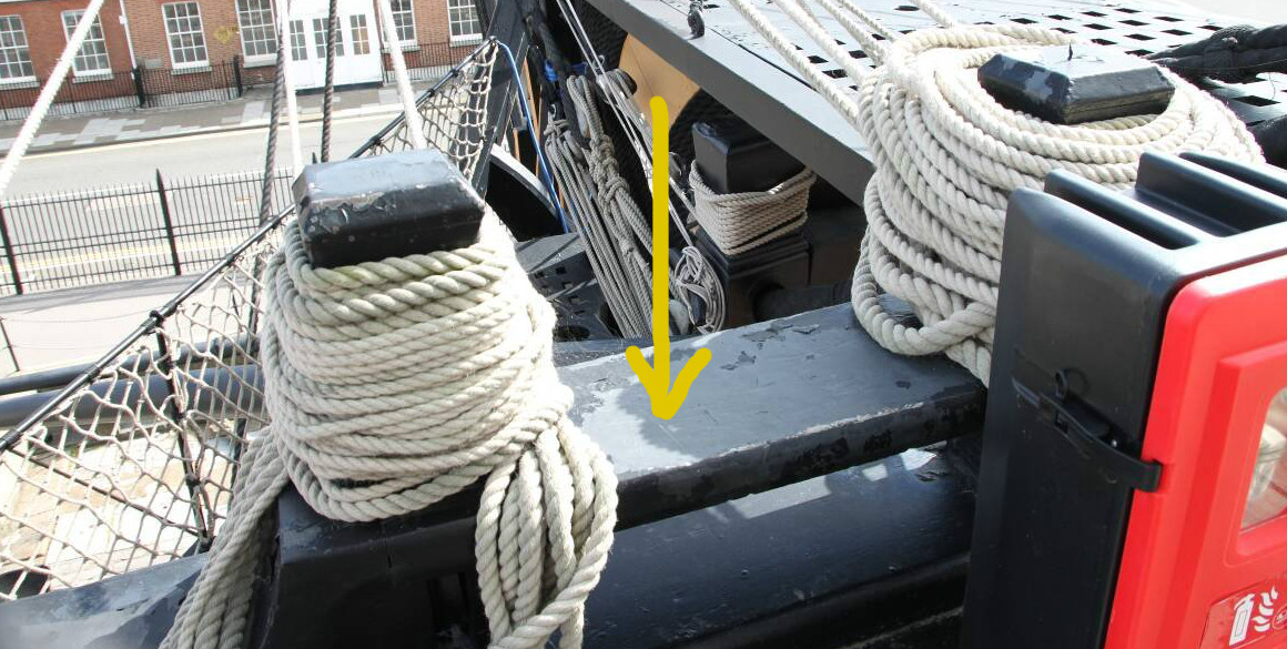 Te otwory to szybry; przechodziły przez nie liny biegnące od strony bukszprytu zanim zostały odłożone na pachołach na tej dziobowej belce.