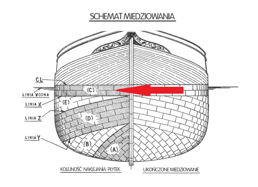 Jeszcze w kwestii układania miedziowania na poszyciu. Poniżej link do ciekawego materiału. Jak widać nie ma 100% zgodności co do tego, czy płyty były układane od kilu do LW, czy odwrotnie.