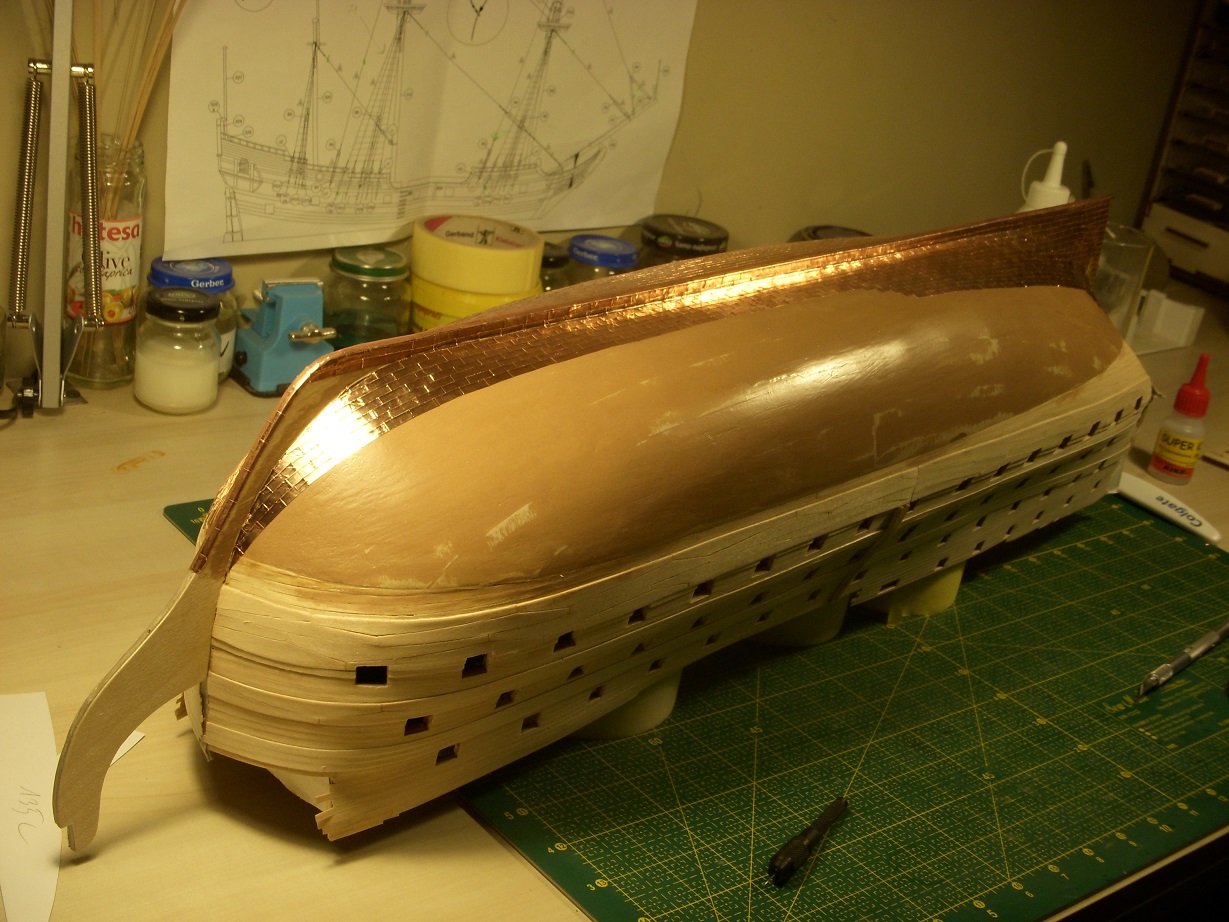 Nie wiem Wojtku czy dobrym pomysłem jest układanie miedzianych płyt jeszcze przed malowaniem kadłuba. Może się okazać, że później ładne pomalowanie kadłuba na styku z pasami miedzi nie będzie takie proste. Na tę miedzianą taśmę może być trudno nałożyć taśmę maskującą z uwagi na schodkowe zachodzenie płyt na siebie. Proponowałbym pomalować przynajmniej ten dolny czarny pas i dopiero później układać płyty.