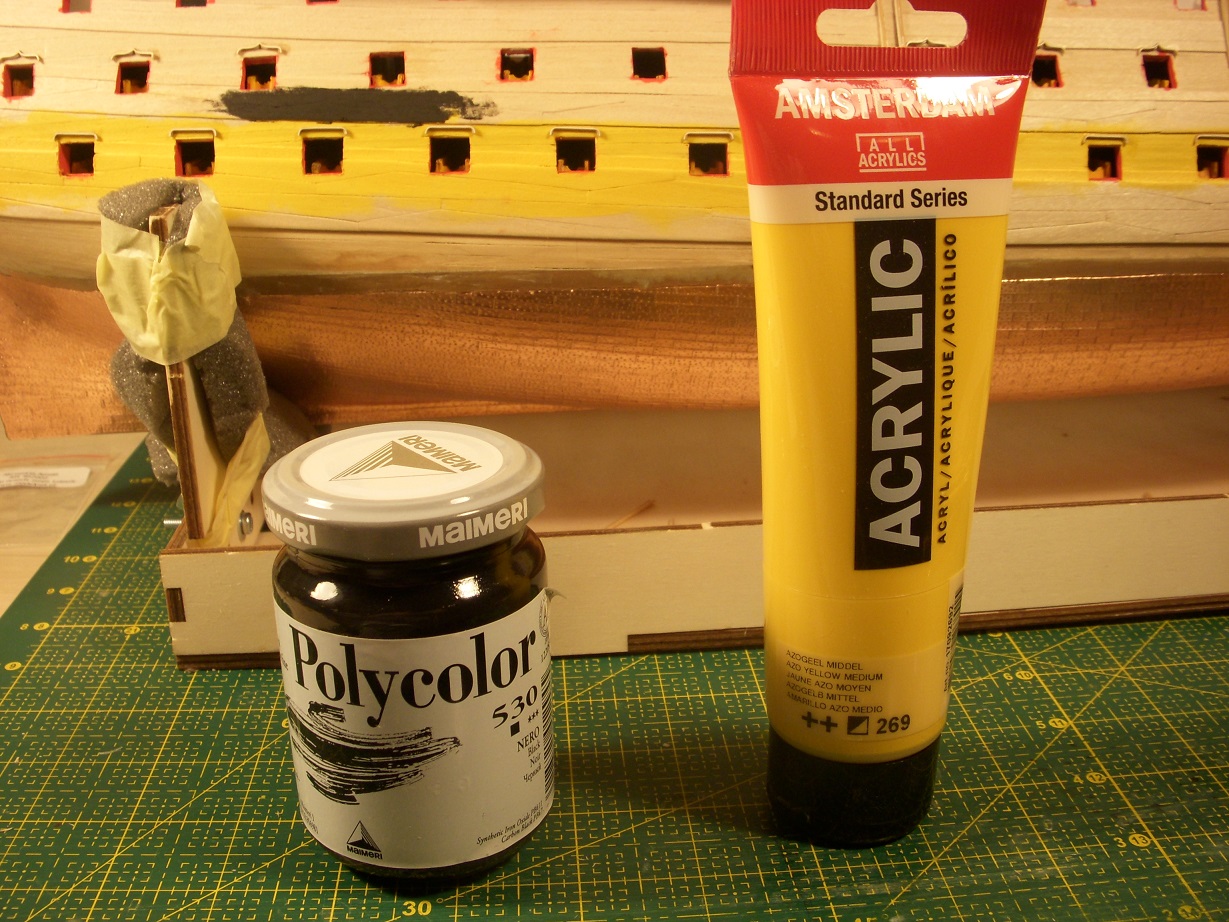 Wydaje mi się Wojtku, że to nie jest tylko kwestia koloru podkładu, ale samej farby. Jak widać na załączonej fotce, używasz farby o właściwościach półkryjących (półtransparentnej). Widoczne jest to na znaczku umieszczonym na farbie (mały kwadracik ukośnie zabarwiony na czarno - biało). Użycie takiej farby powoduje, że określony element musisz malować kilkoma warstwami, aby uzyskać jednolitą barwę. Lepsze w działaniu są farby kryjące (oznaczone kwadratem w całości zakolorowanym na czarno). Do uzyskania końcowego efektu malowania potrzebujesz wtedy mniej warstw. Taka w pełni kryjąca farba może być lepsza zwłaszcza, gdy chodzi o kolor żółty, który jest chyba jednym z najtrudniejszych kolorów do położenia. Ten kolor sam w sobie ma słabe właściwości kryjące; podobnie słabe właściwości kryjące wykazują farby o barwie pomarańczowej i czerwonej. Nie wiem czemu, ale tak jest.