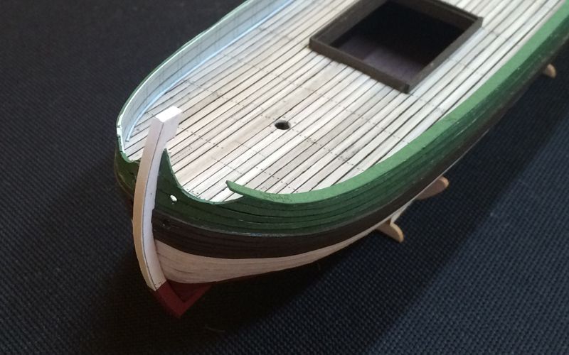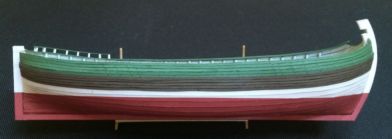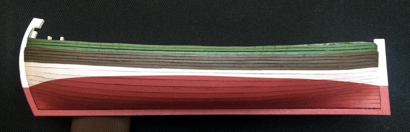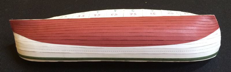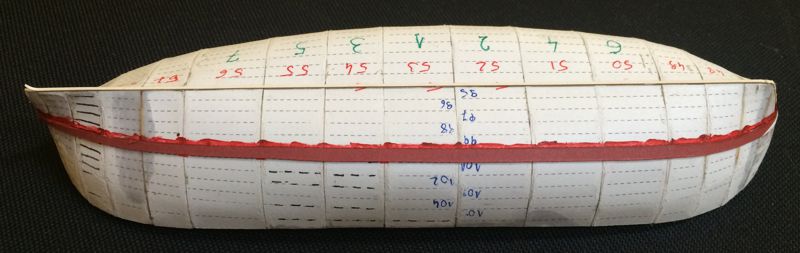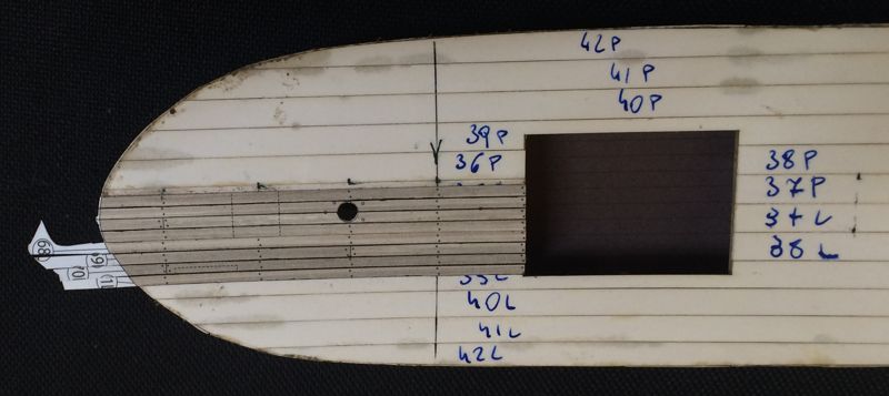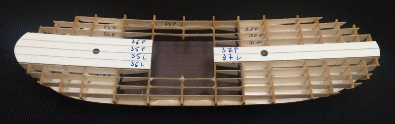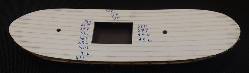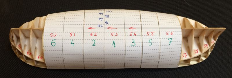 ... po czym wyszlifowałem skosy na wręgach i zacząłem przyklejać podposzycie. Tu nie sugerowałem się numeracją części lecz zacząłem oklejać od środka okrętu jednocześnie ku dziobowi i rufie (kolejność klejenia oznaczają zielone numery). Oczywiście NIE wyciąłem od razu wszystkich elementów podposzycia, ale wycinałem je pojedynczo i dopiero gdy spasowałem poprzedni element wycinałem kolejny (tu muszę przyznać, że opracowanie modelu jest bardzo dobre - spasowanie sprowadzało się do stwierdzenia, że wszystko pasuje