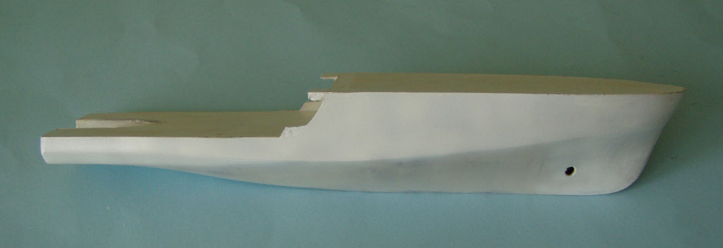 Przestrzenie pomiędzy wręgami wypełniłem styropianem (z opakowania po AGD -jest twardszy ) wklejonym na klej polimerowy.Po wyschnięciu obciołem nadmiar i dokładnie wyszlifowałem.Widok kadłuba po wstępnej obróbce