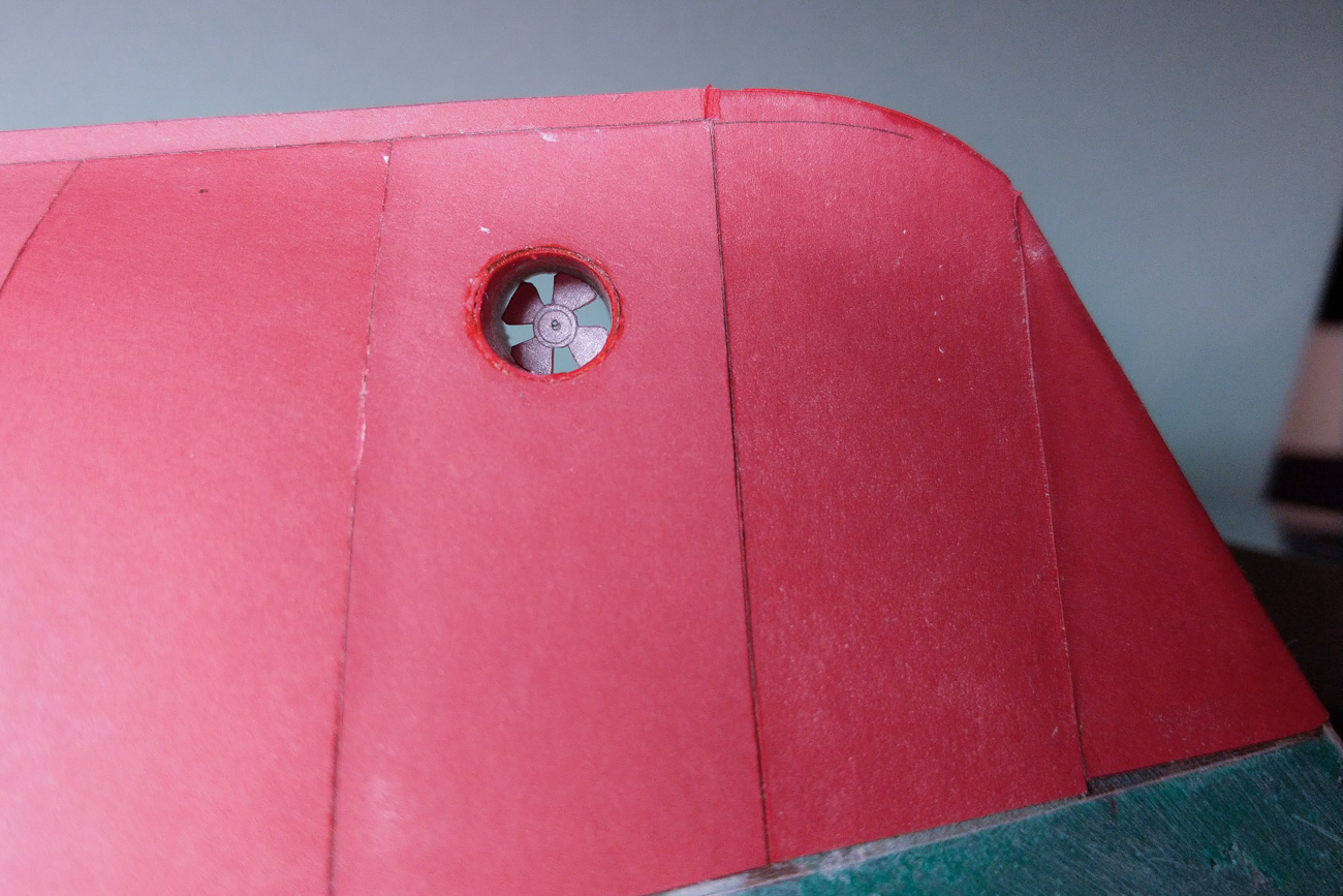 Powstała też rura steru strumieniowego i śruba, pozostało przykleić kratę, która trochę zamaskuje miejsce klejenia rury z poszyciem dna.